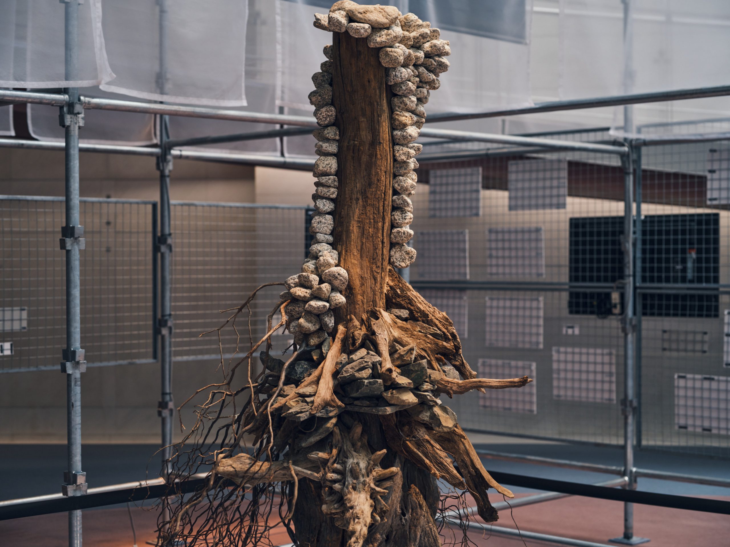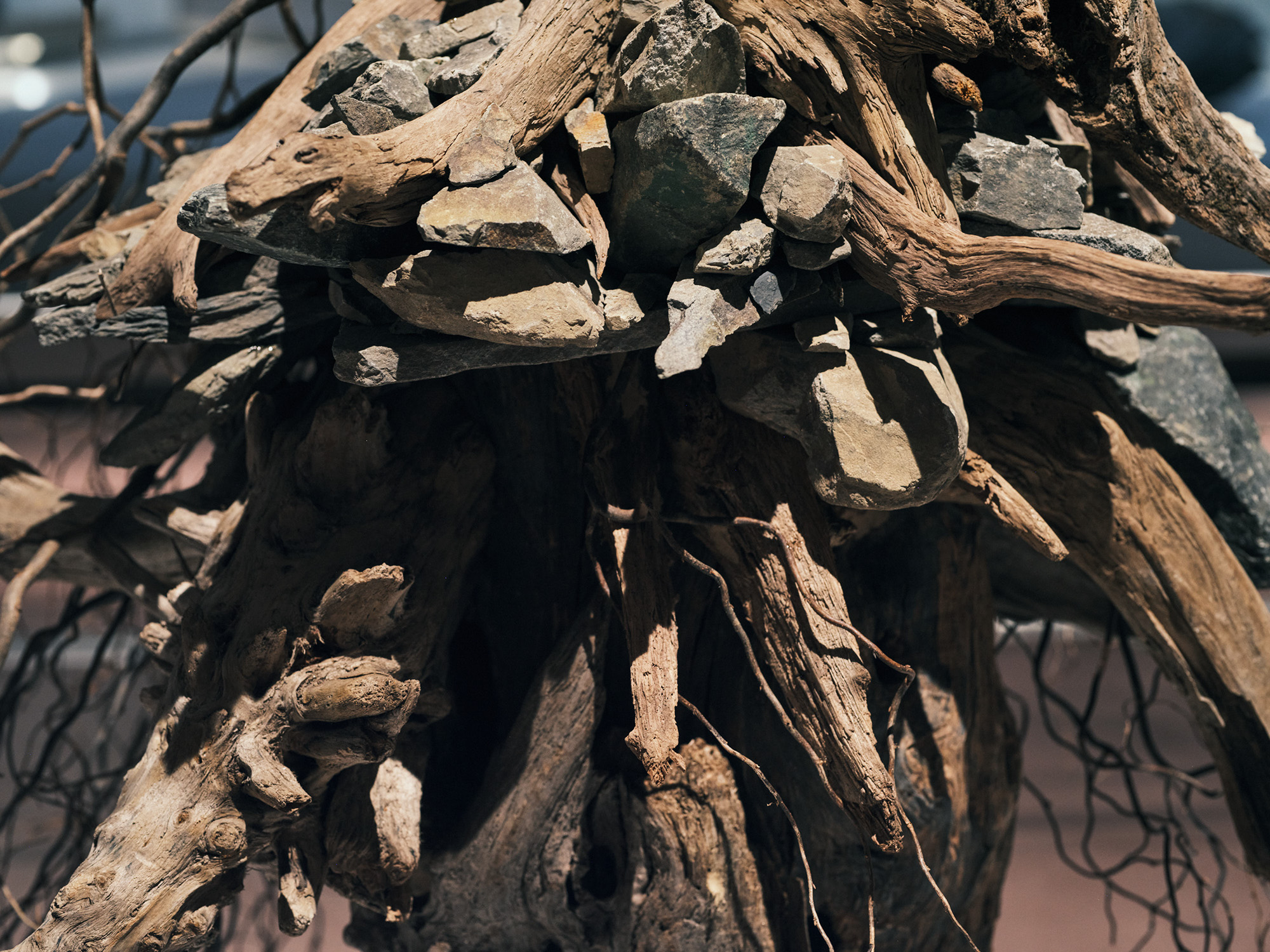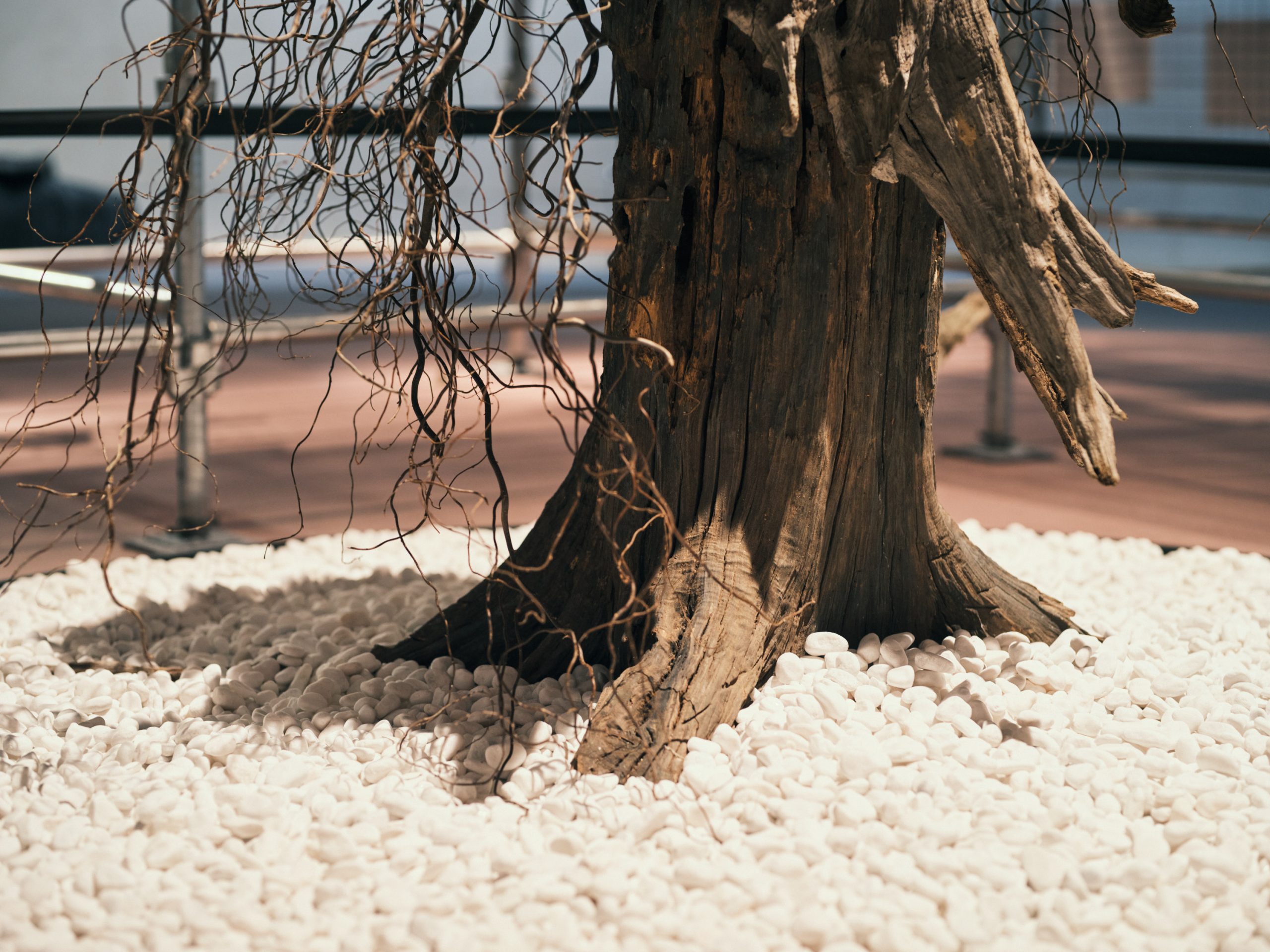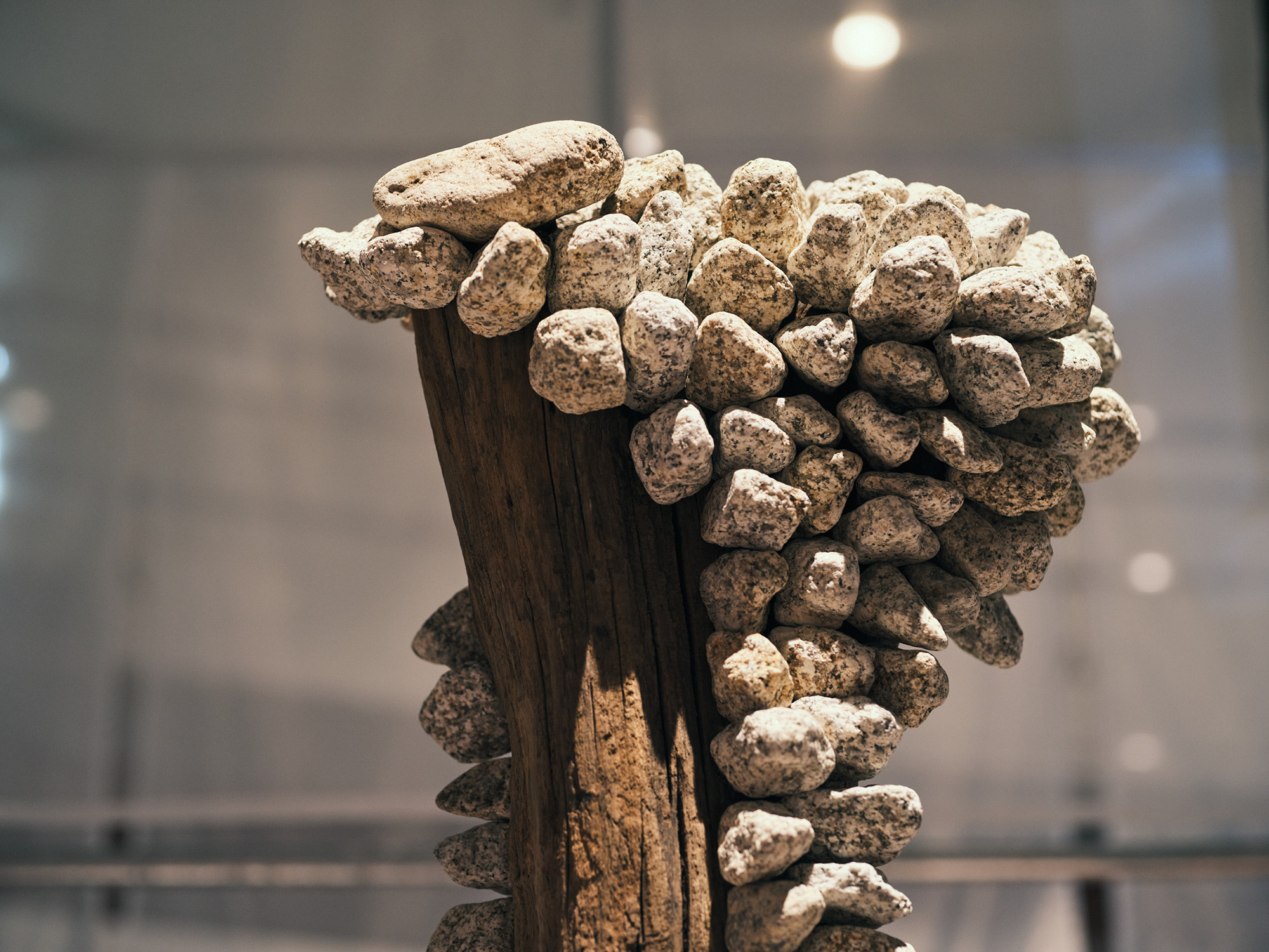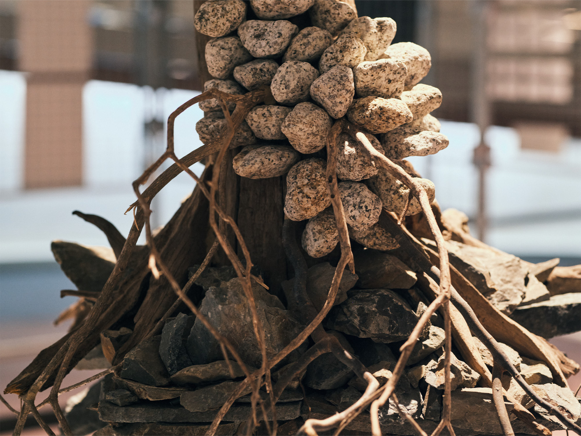 積み上がるのは、これまでに経てきた時間も、これからの経年変化も異なる、個性を持ったいくつかの素材たち。 作品の周辺に出現する気配は、日本に古くから伝わる茶の湯における茶室のように機能する。それは、すべての人が立場を超えて平等になる場所、人が等価になる空間である。異なるテクスチャに触れ、その温度を感じ、足元の玉砂利を踏み、その音を聞く。見るものの意識が入り込むことができる空間は、平和や多様性が単に観念的なものでなく、具体的な体験として立ち上がる。