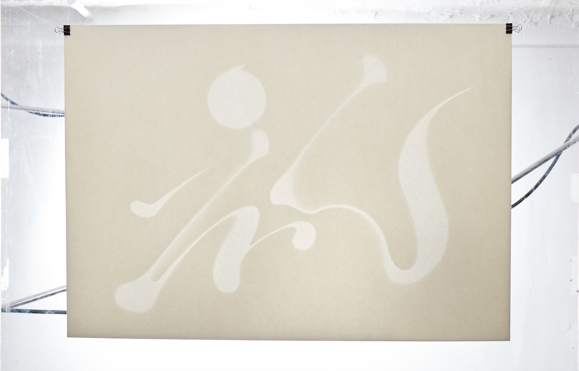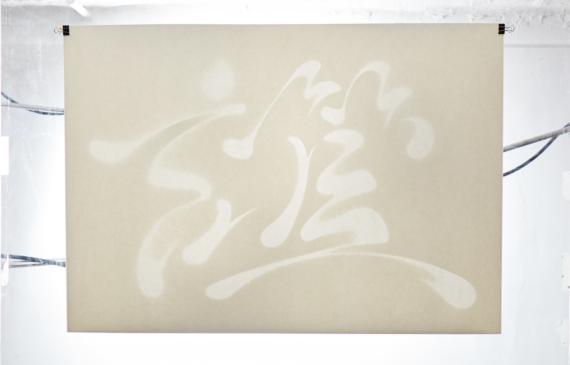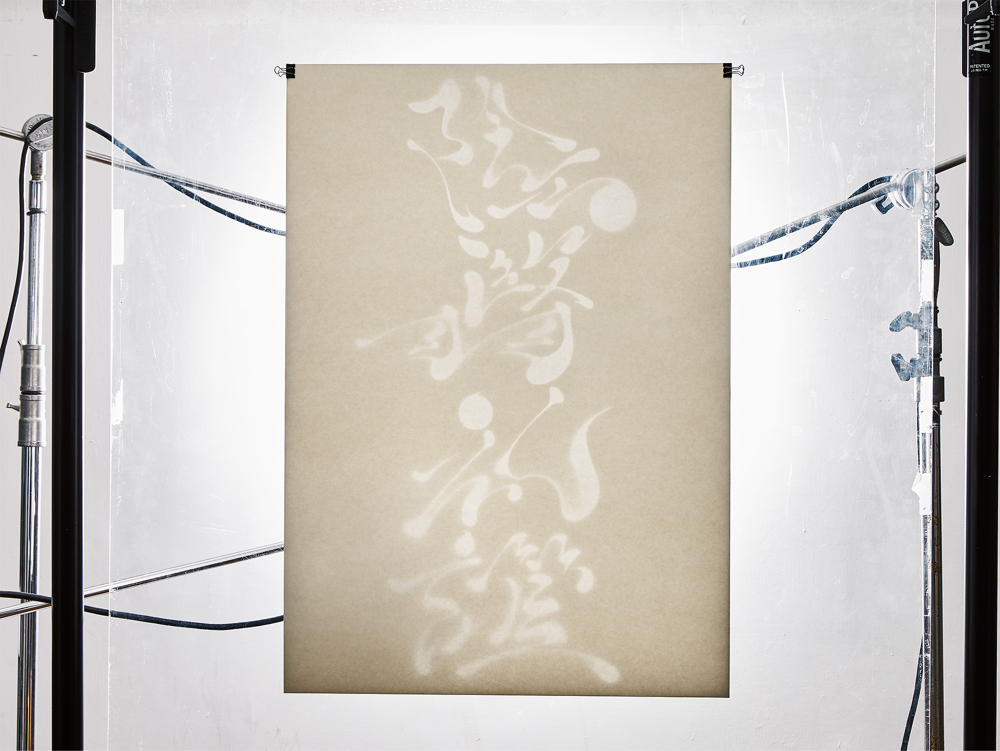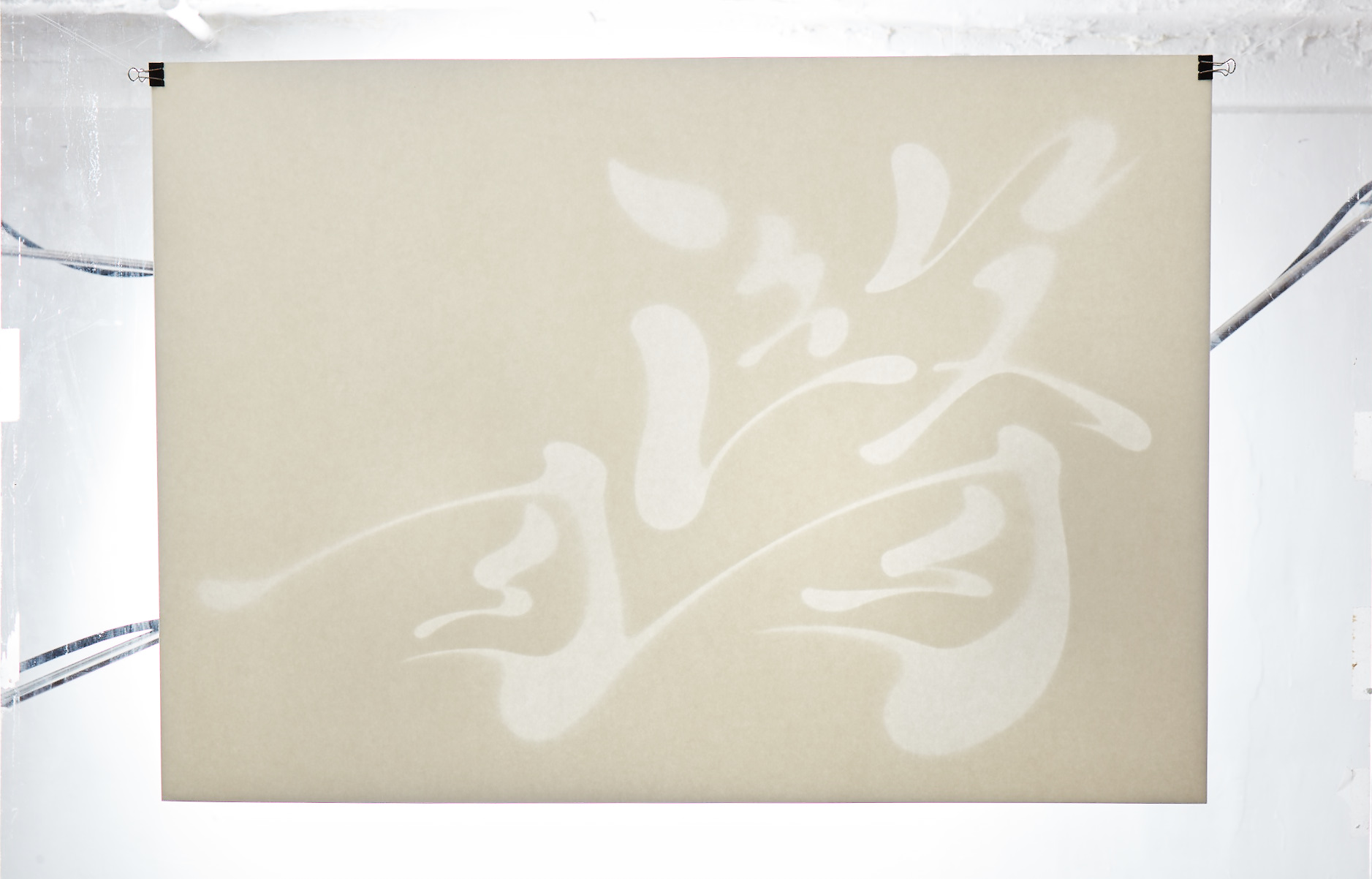 和紙を切り抜いて作られた文字は、背後からの光によってそのプロポーションが浮かび上がり、薄暗い空間に溶け込むように輪郭をにじませる。