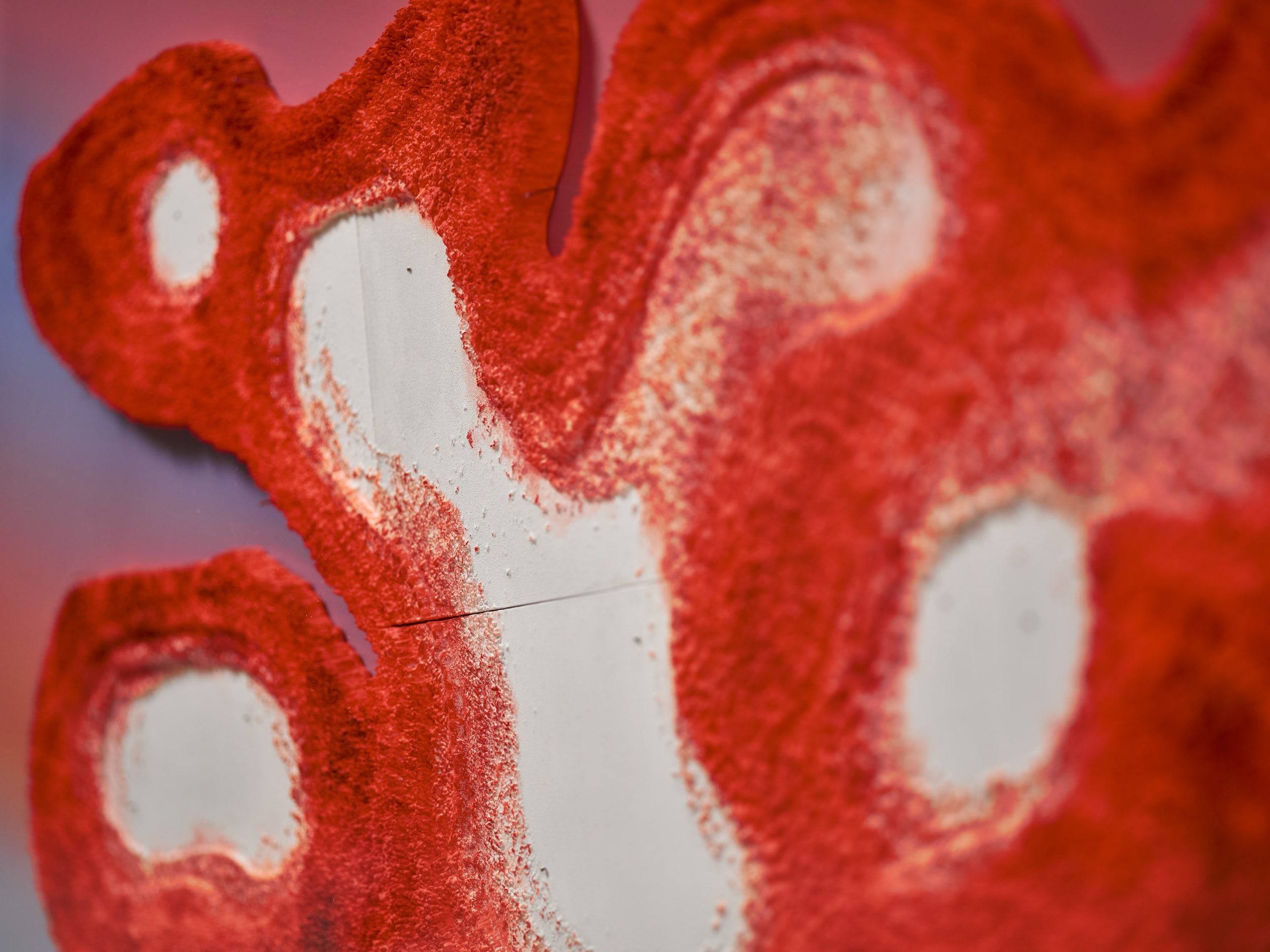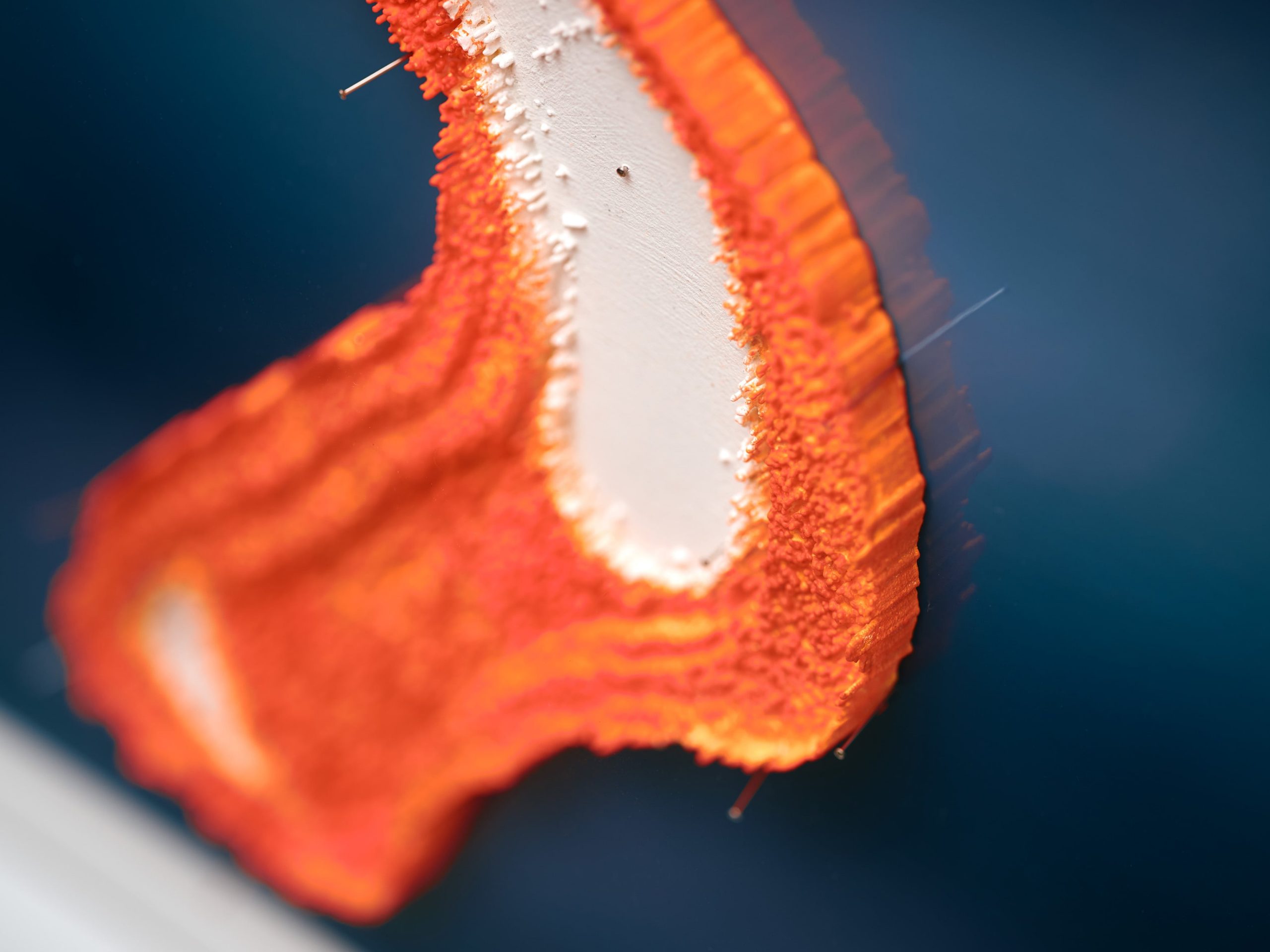 本シリーズでは、音の中に潜む形をスペクトログラムで抽出し、拡大した後に3Dプリントで立体化する。さらに蛍光塗料で彩色し、昆虫標本用のピンで背景写真に固定する。こうして立ち現れた形は、言葉では表現しきれない曖昧さを象徴する。蛍光塗料の色は、元の対象が持つ無限のニュアンスを、鮮やかな単色として一度に可視化することの比喩となっている。