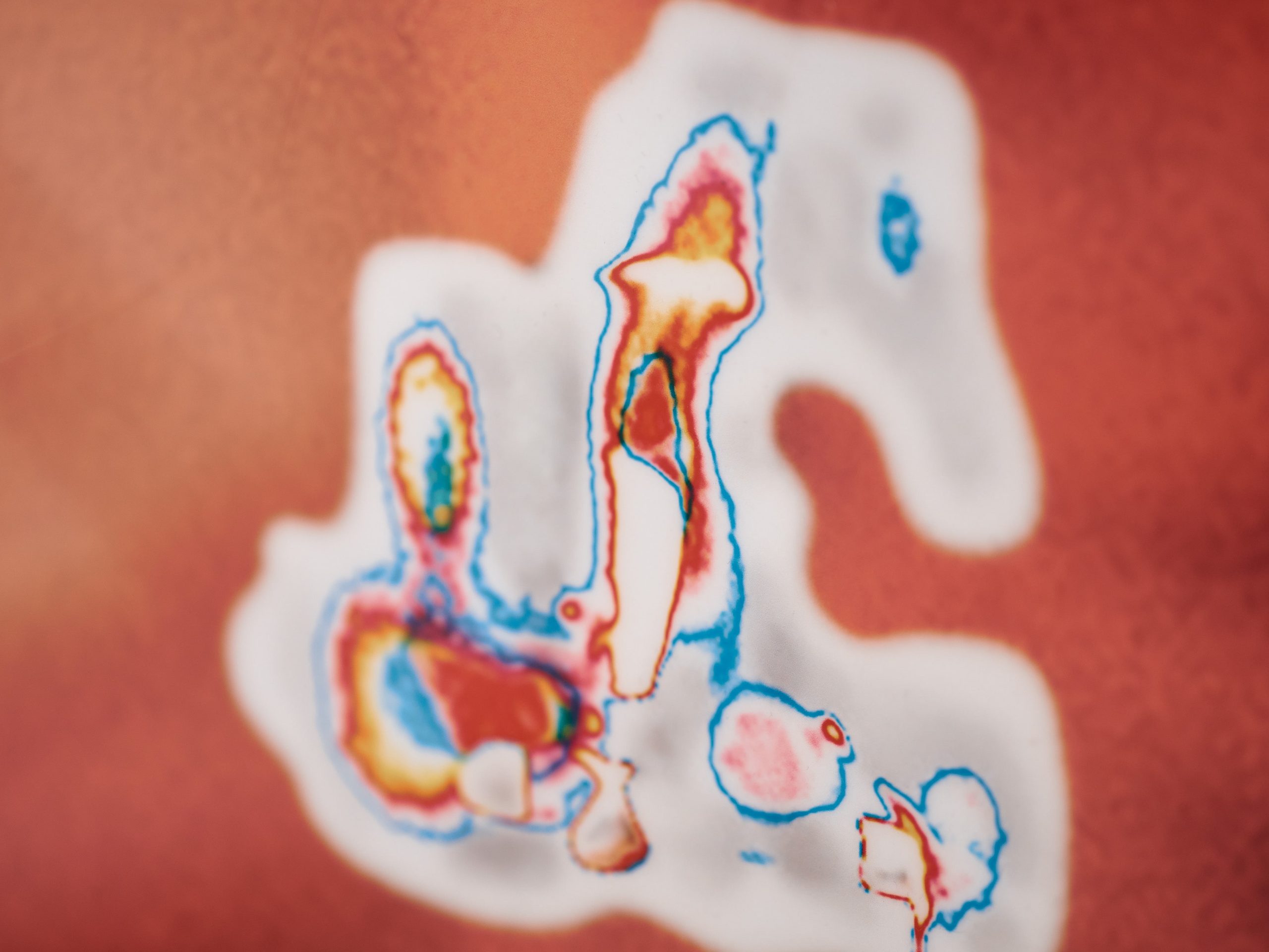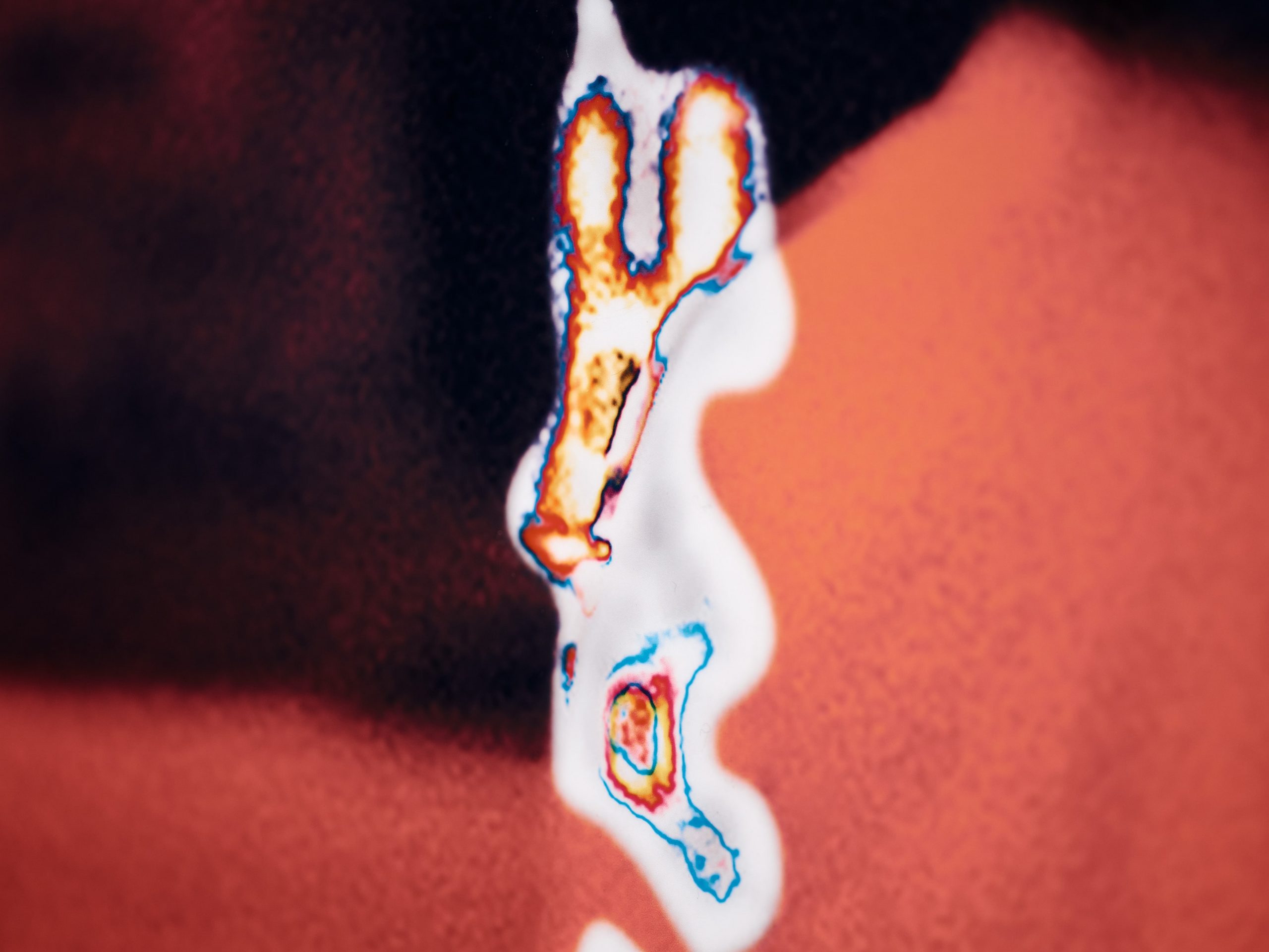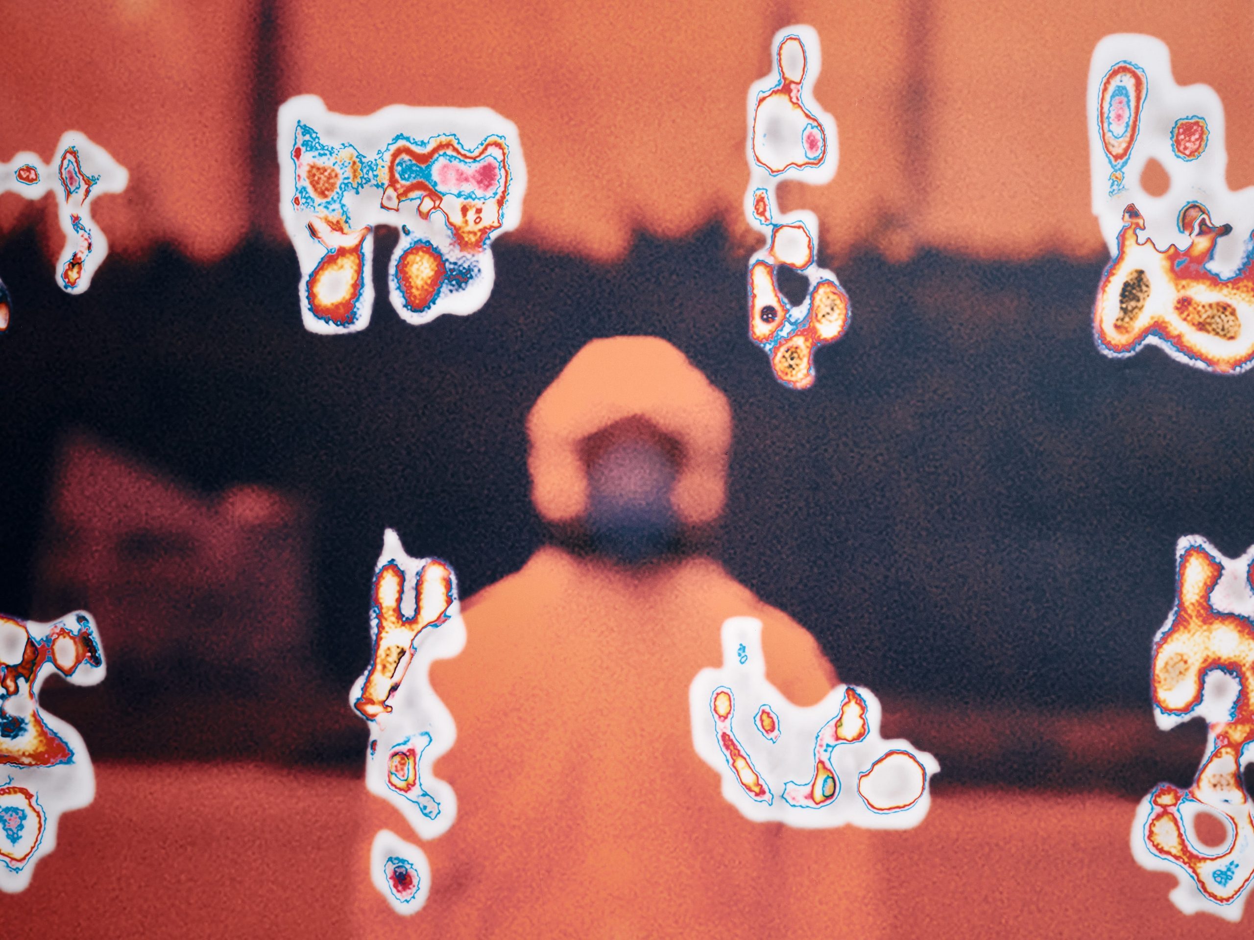 ソノグラフの図形の背景になっているのは、福島第一原子力発電所事故現場の作業員の写真です。私は事故を伝えるニュース映像の音声トラックのソノグラフから採取した20の図形を、画面上に配置しました。文字や言葉ではないこれらの形は、被害を受けた人々の伝えきれない想い、ニュースからこぼれ落ちてしまった、事故現場に漂う空気感を体現しています。