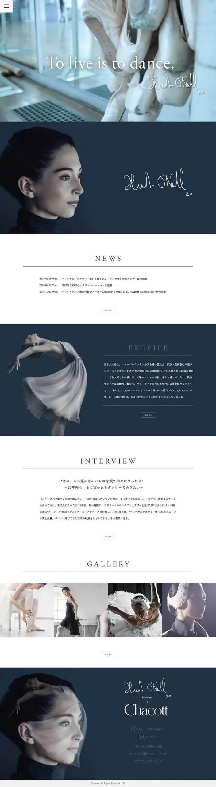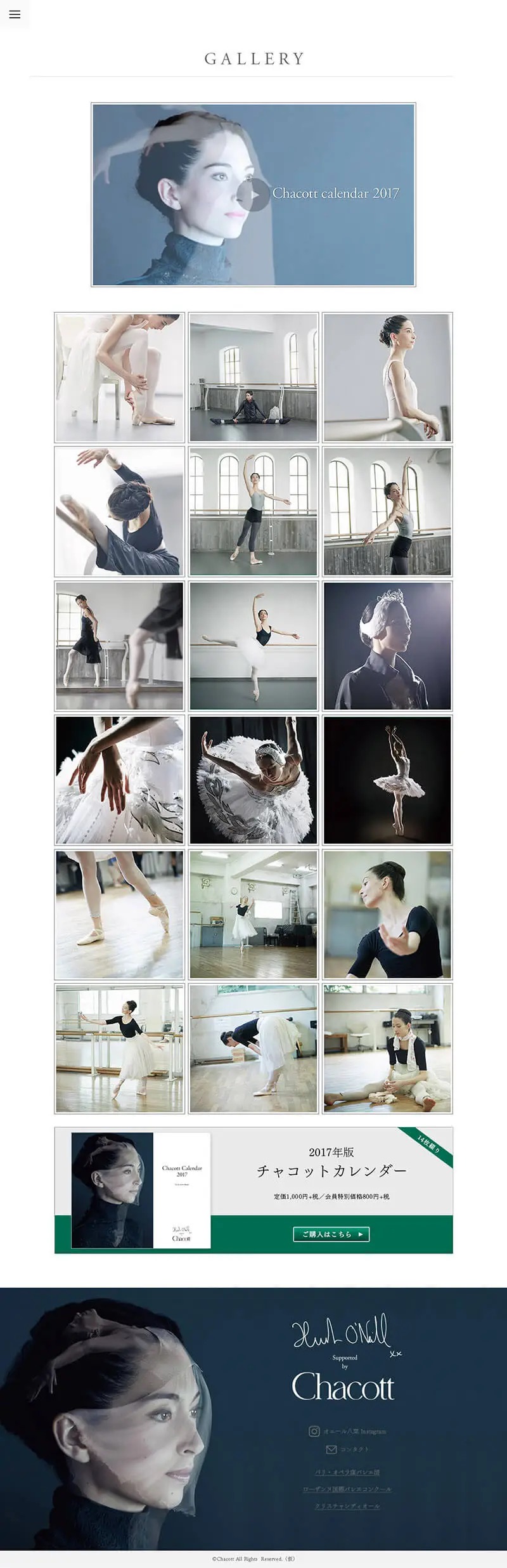 バレエ・ダンス用品の総合メーカーとして、“ダンサーに善きことを”をコンセプトに事業を展開するチャコット株式会社の企業姿勢を訴求するためのブランド戦略として、パリ・オペラ座のトップダンサーであるオニール八菜さんをモデルに迎え、2016年度シーズンビジュアル・コピー・2017年カレンダー・WEBサイト・ムービーの企画・アートディレクション・制作を手がけました。