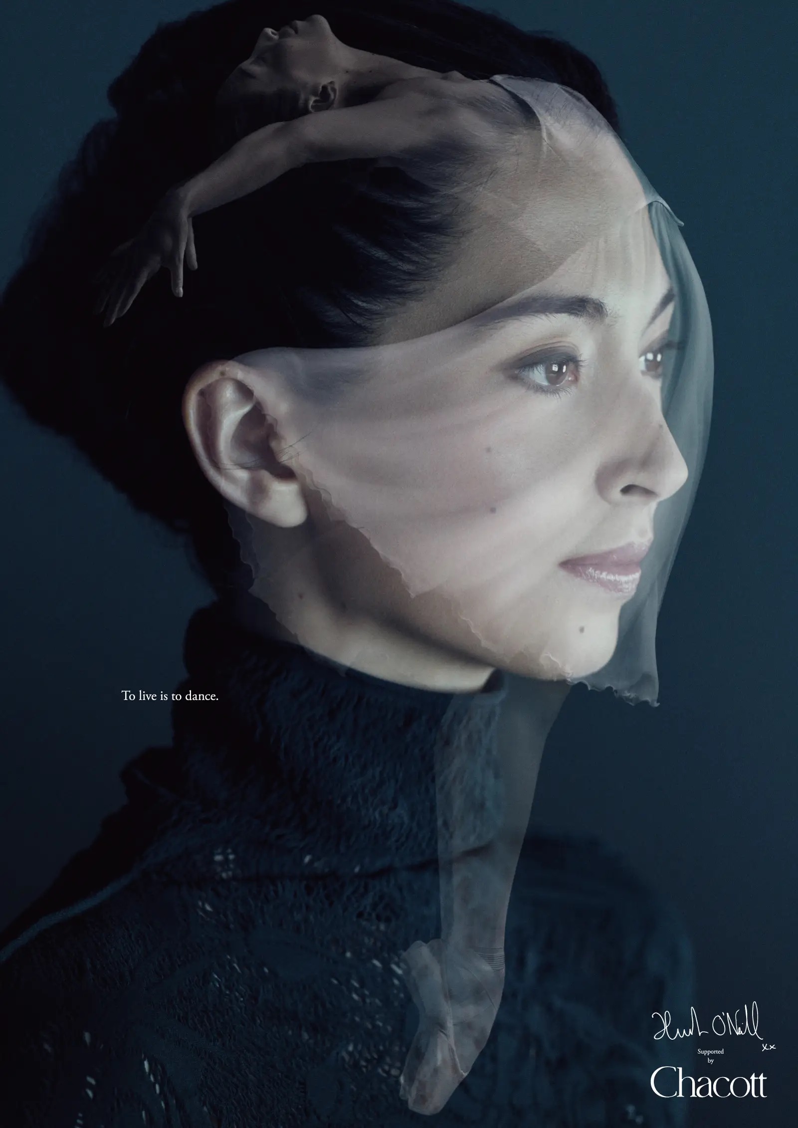また、全身のポーズと上半身アップの2枚の写真をベールのように重ね合わせたキービジュアルは、オニール八菜さんの心の内面や芯の強さを表現しています。海外のバレエ公演やコンクール等、世界中でこのビジュアルが使われることを考慮し、『To live is to dance』というコピーと「Hanna O’Neill supported by Chacott」以外の文字要素を排し、ビジュアルだけでメッセージが伝わるよう意図して設計しています。