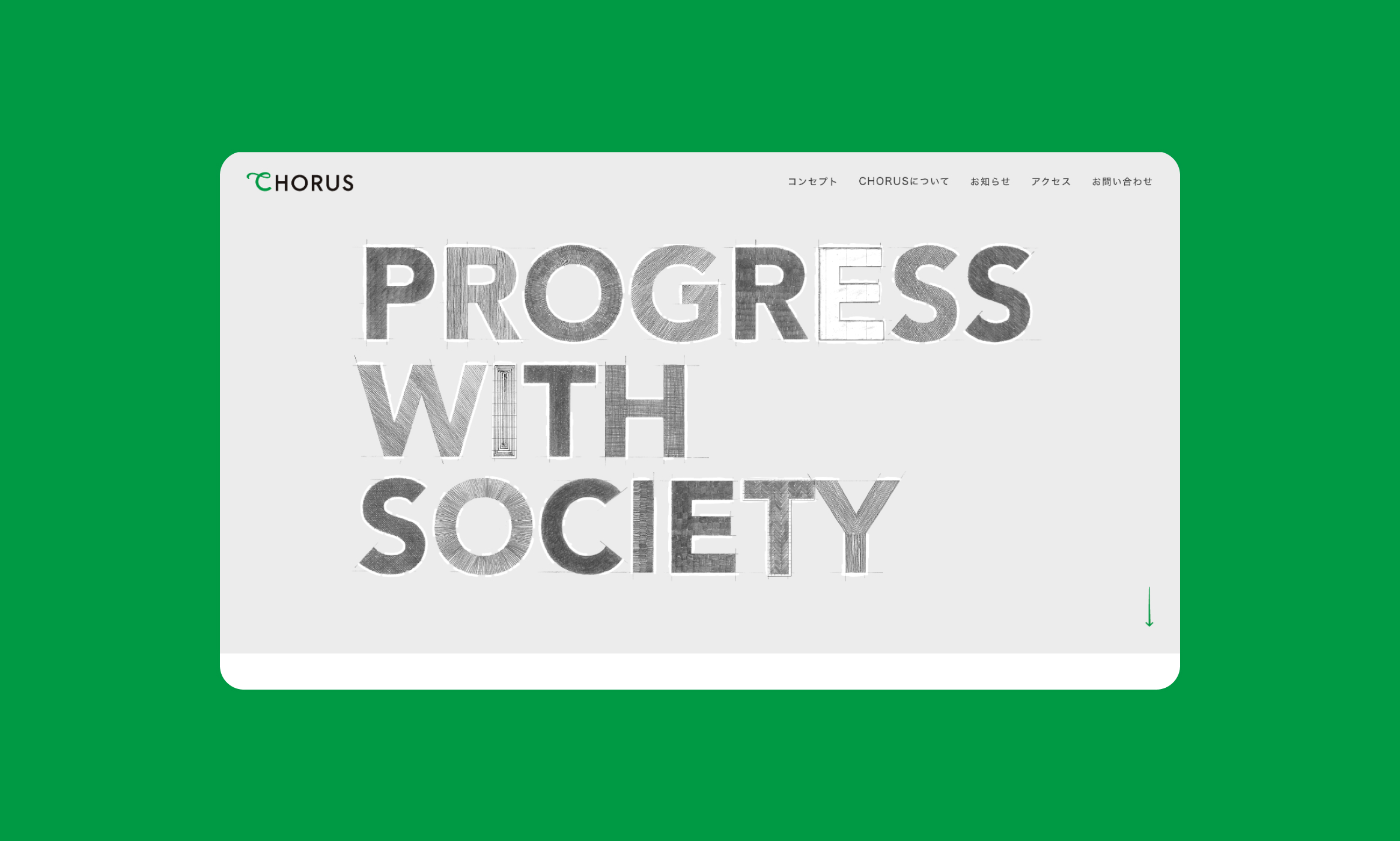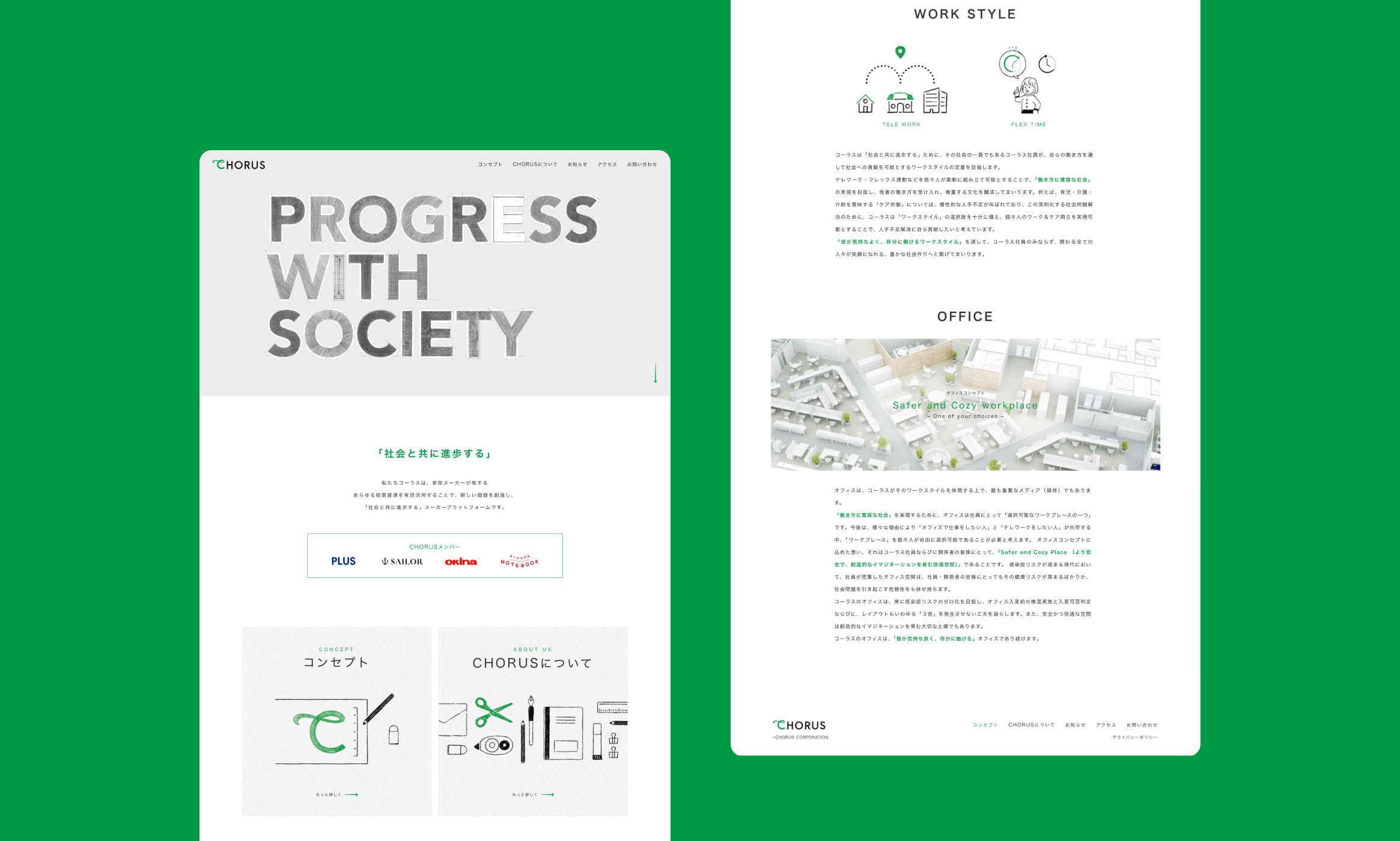 ロゴデザインでは、手書きの筆勢とモダンな書体を共存させた「C」の文字で、文具事業を原点としながらも、変化を恐れず、力強く躍進・成長していく企業姿勢を表現しています。また、コーポレートサイトTOPのキービジュアルでは、「異なる個性・スキル・経験を持ったプレーヤーが集い、互いの切磋琢磨を通じて生み出す美しいコーラスを社会に響かせたい」という同社の想いを表現するため、『Progress with Society ー社会と共に進歩するー』というコンセプトを、多様な文房具を使って、アナログ的にタイポグラフィで可視化しました。