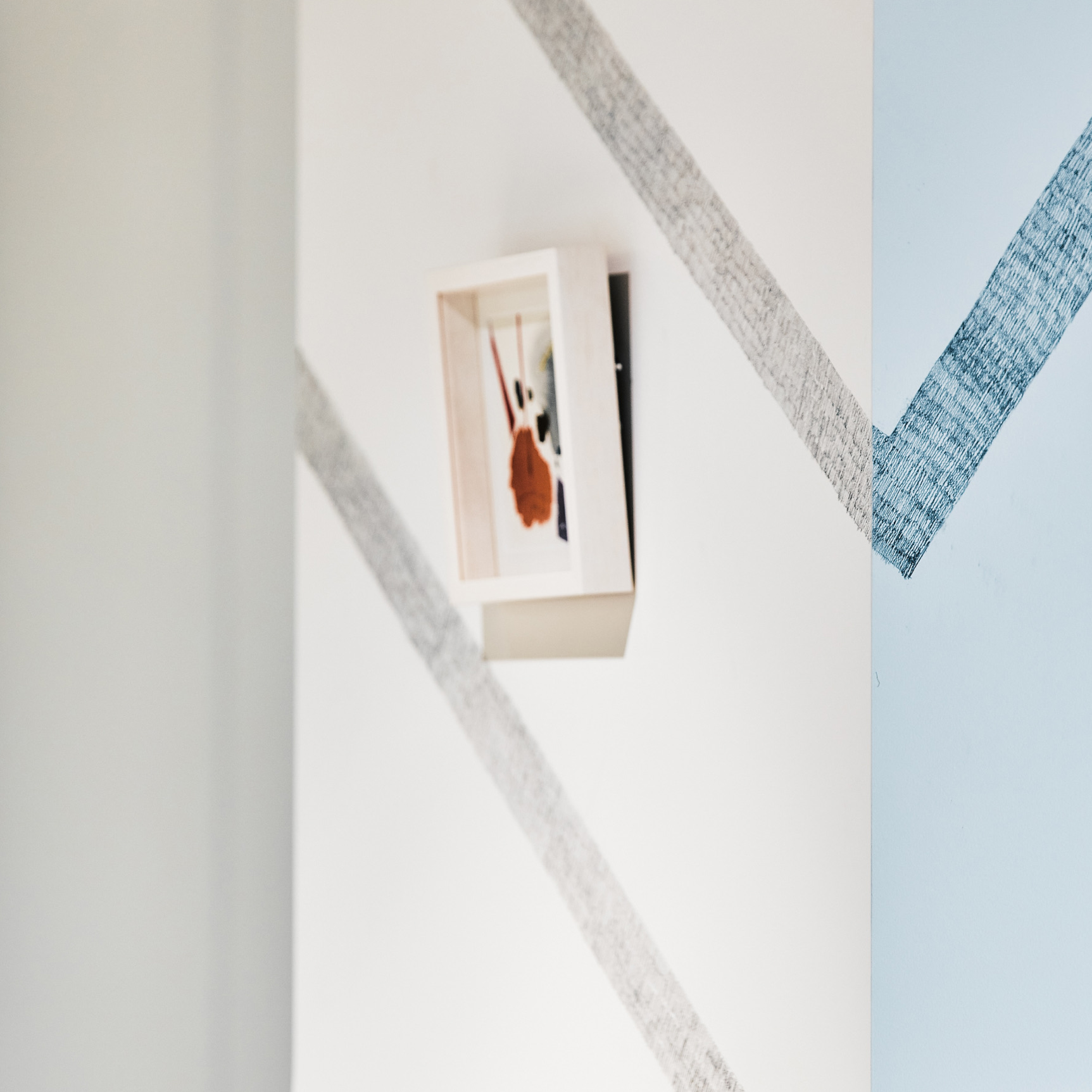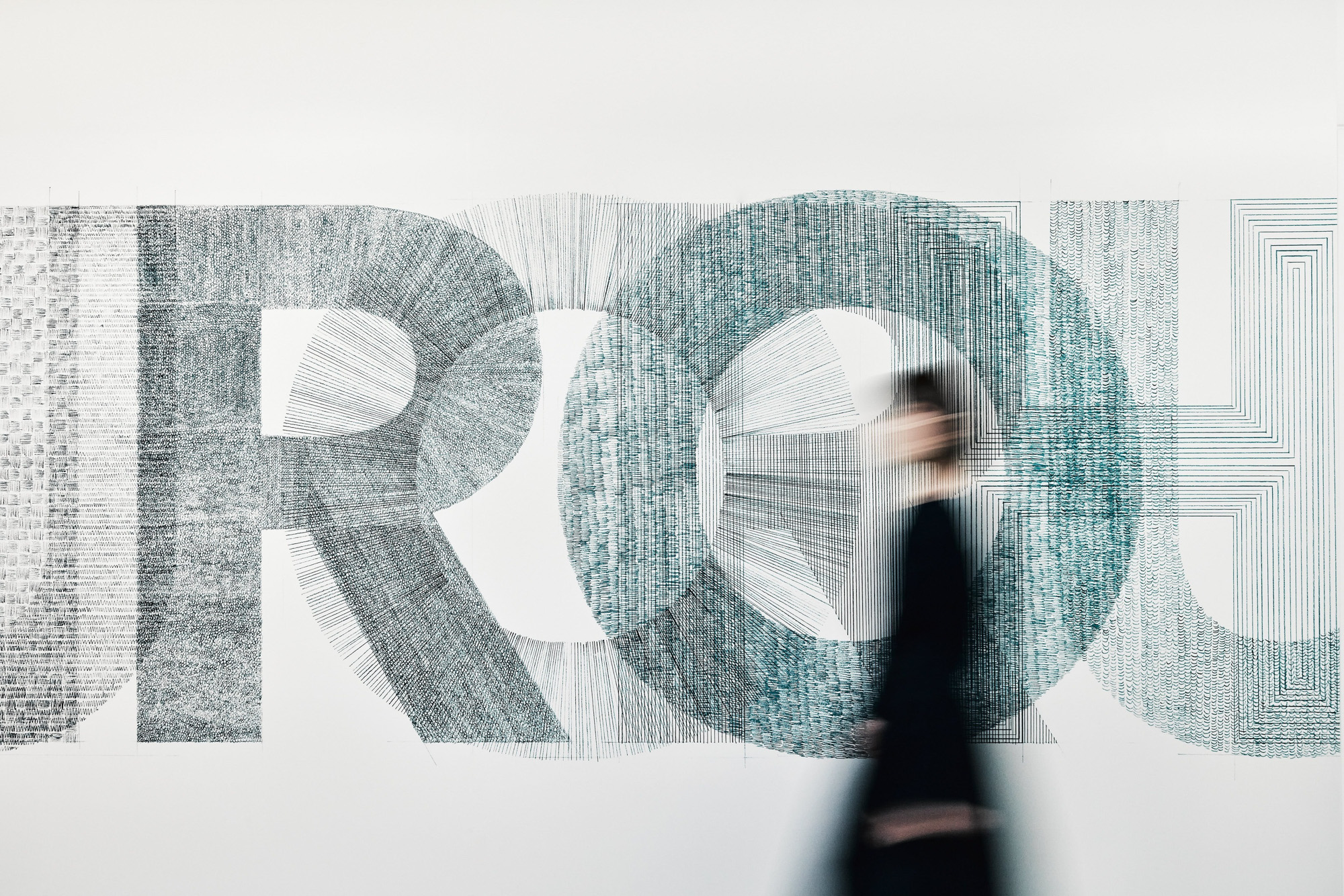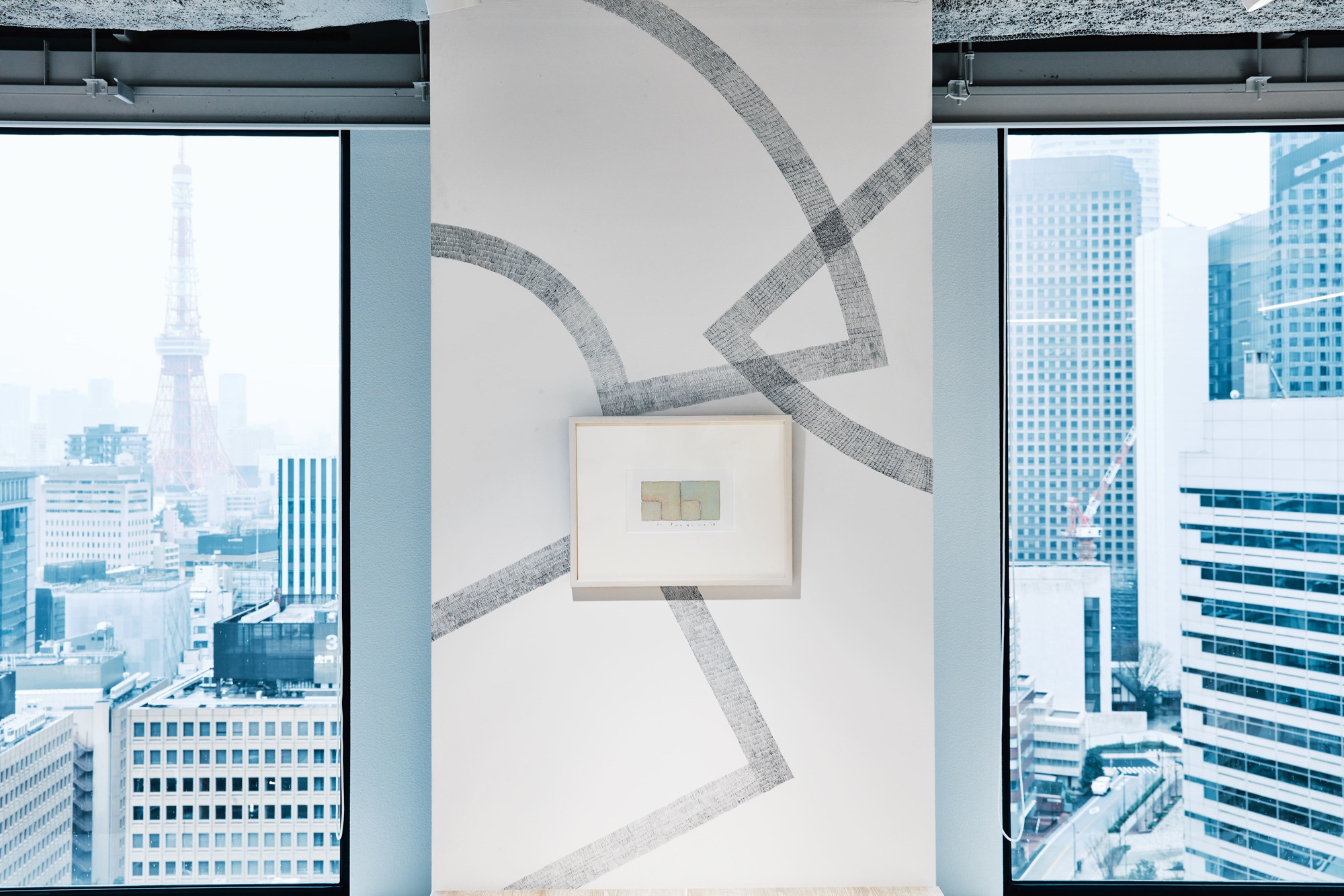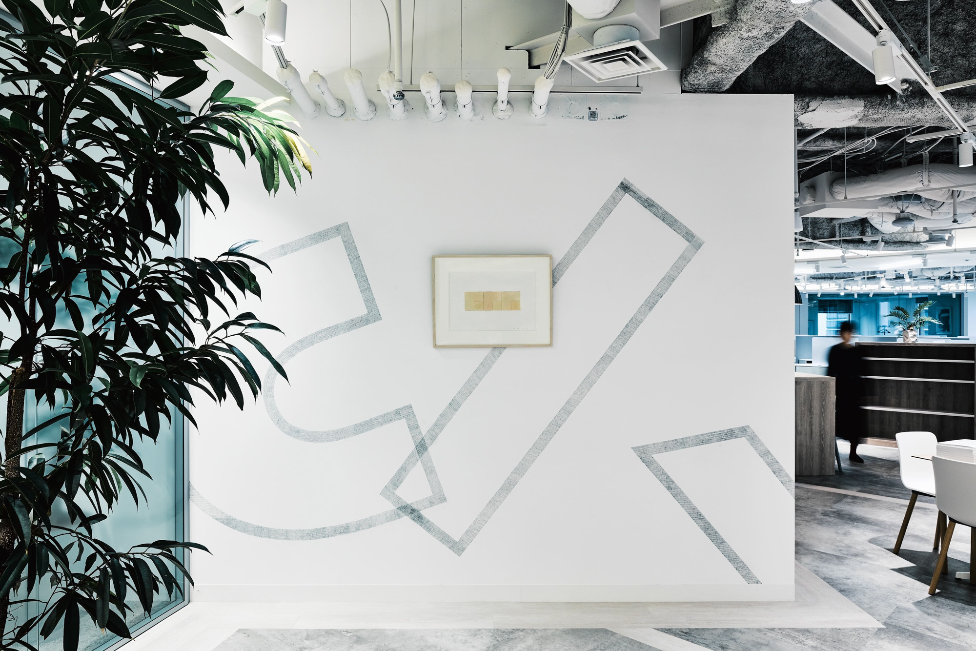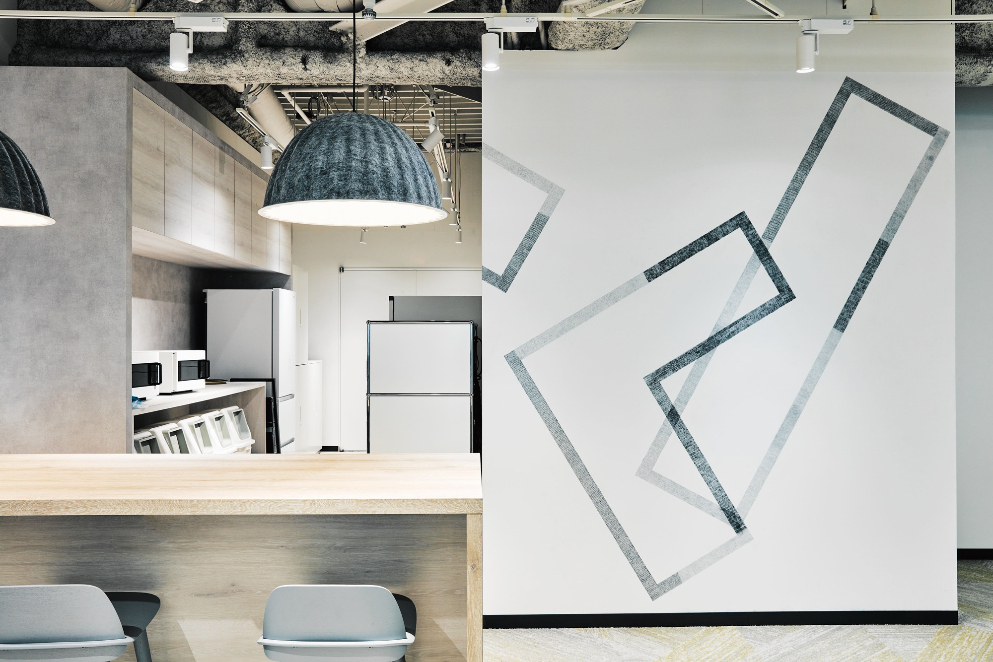 共用部からのテンションをオフィスのワークスペースにも連続させるため、オフィス壁面にも統一した印象でグラフィックを展開しました。グラフィックはオフィス空間の景色として馴染むよう、「CHORUS」の文字を分解し再構築したパターンとして壁面に定着させました。空間の変化にあわせてグラフィックにも自由に変化を加えることで、ブランドイメージを保ちながら、メリハリのあるコミュニケーションを誘発させます。また、グラフィックは全てシャーペンによる手描きで直接壁面に定着させており、人の手ならではの温度感がオフィス空間を包みこみます。総勢22名の学生たちと共にドローイングしました。