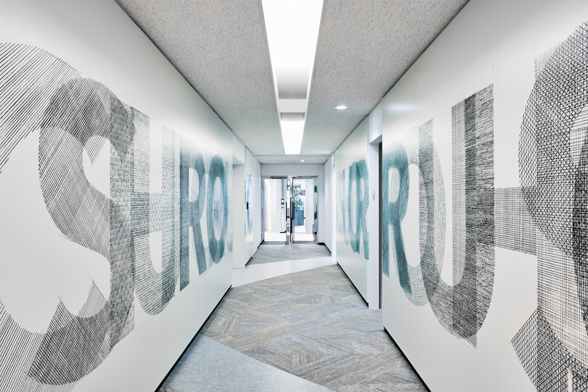 共用部の壁面グラフィックは、オフィスに訪れる人たちがまず最初に目にするものです。フロアに足を踏み入れた瞬間から、キービジュアルを拡張させた手描きのグラフィックが空間を包み込み、ブランドイメージをダイナミックに訴求しました。また、グラフィックは廊下を行き交う動線に沿って両側から「CHORUS」の文字を重ね合わせることで構成しており、重層的なタッチが空間に奥行きとインパクトを与えています。