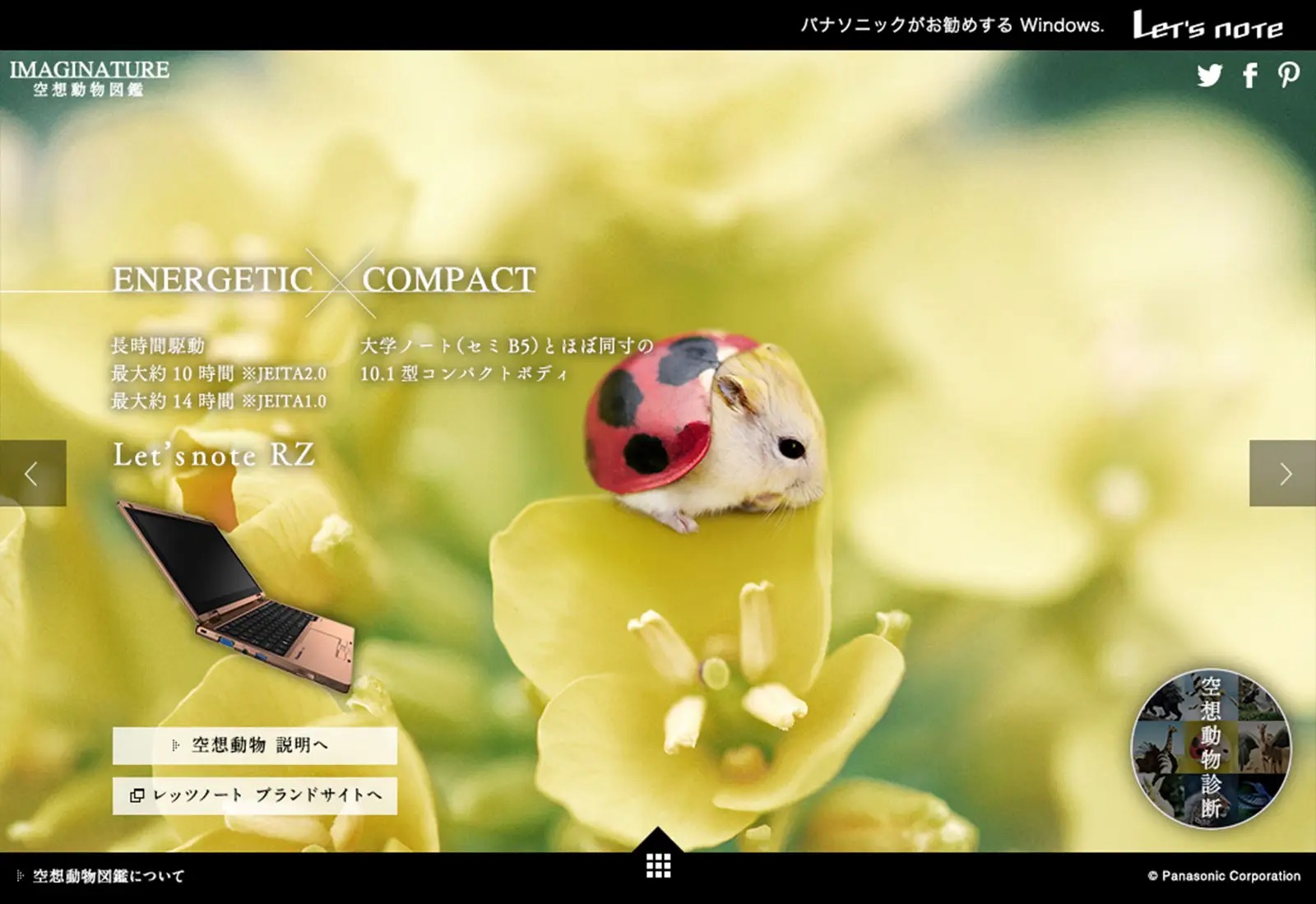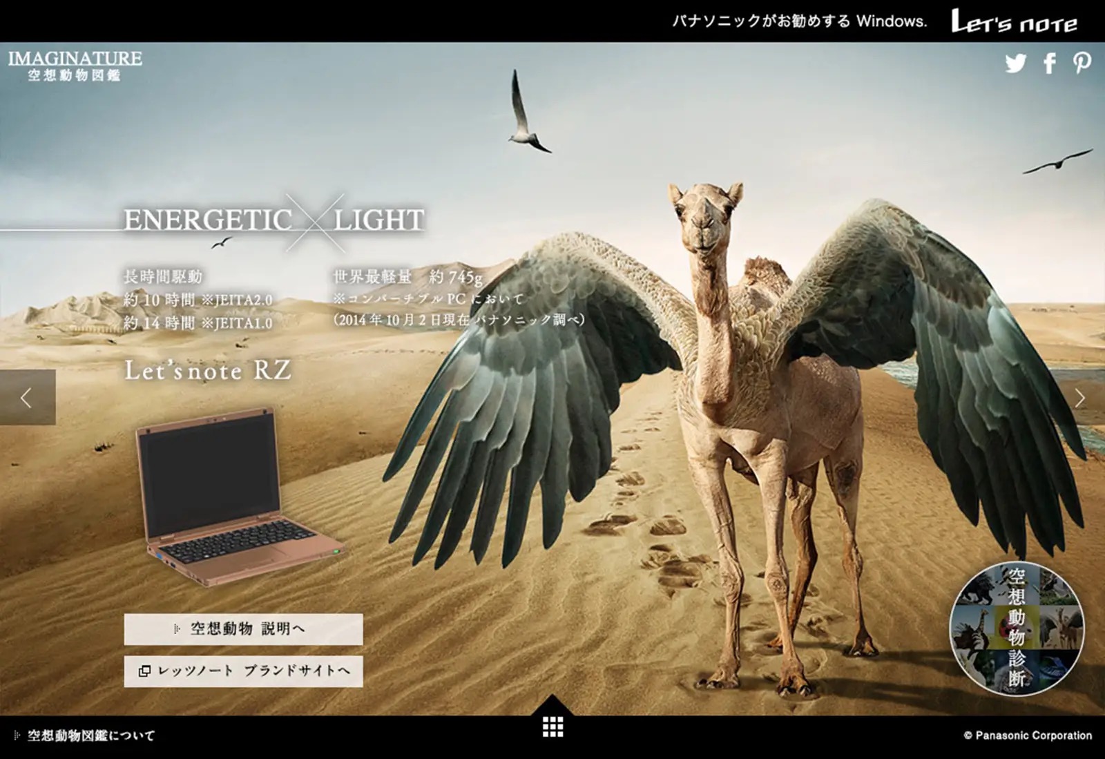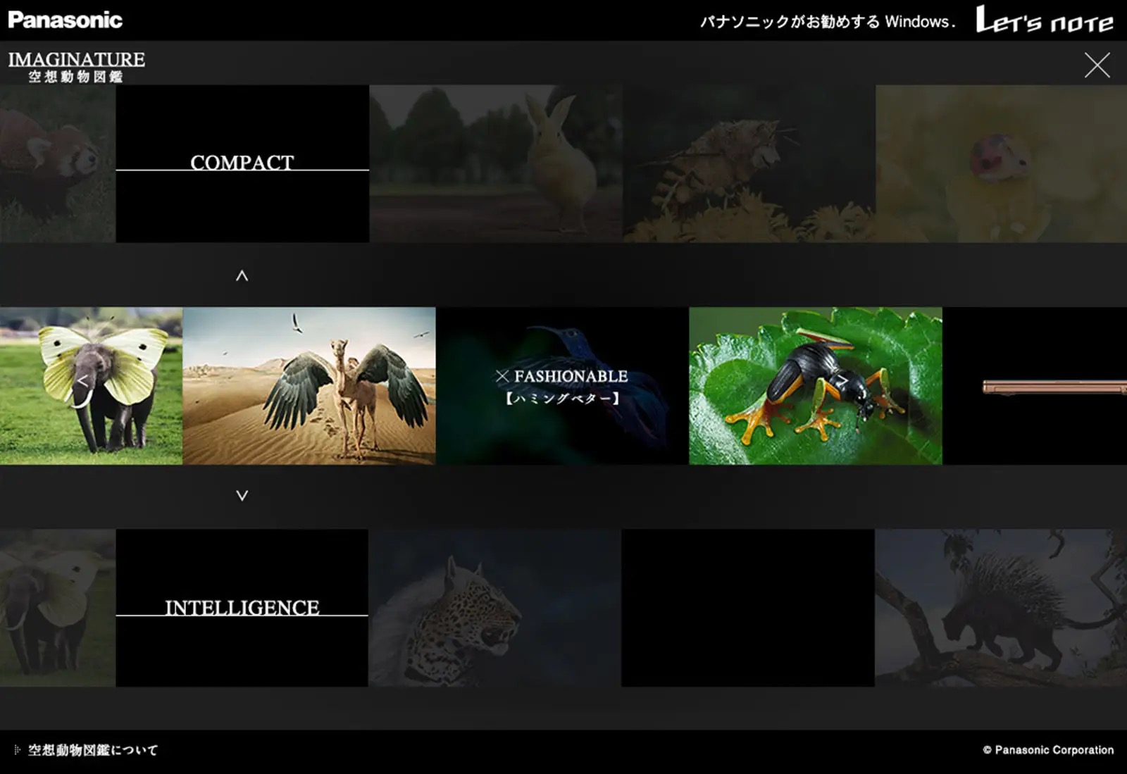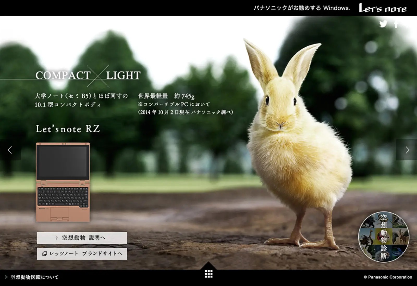 「レッツノートRZシリーズ」を若年層にもっと知ってもらうことを目的に、商品の最大の特徴である、相反する魅力の両立(「軽量なのに、頑丈」、「コンパクトなのに、ハイスペック」など)を表現するため、商品を象徴する存在として、異なる魅力を持つ動物を2種組み合わせた「空想動物」で表現したバーチャル上の『空想動物図鑑』を制作しました。