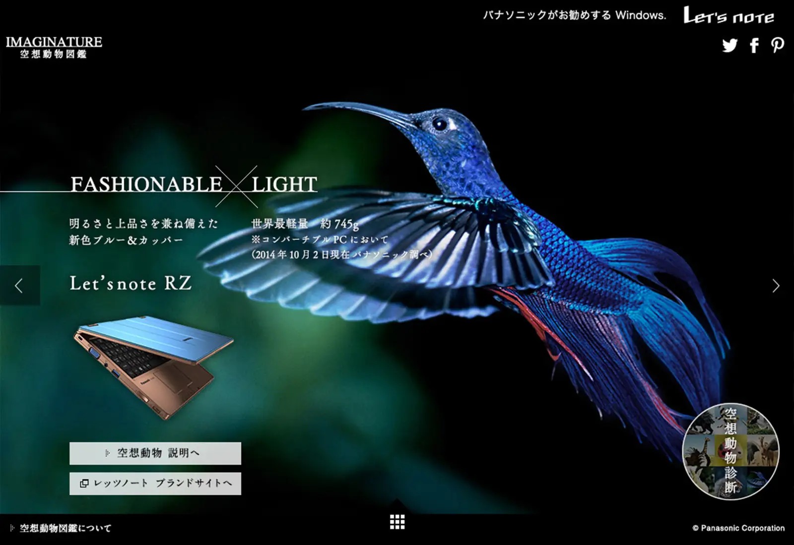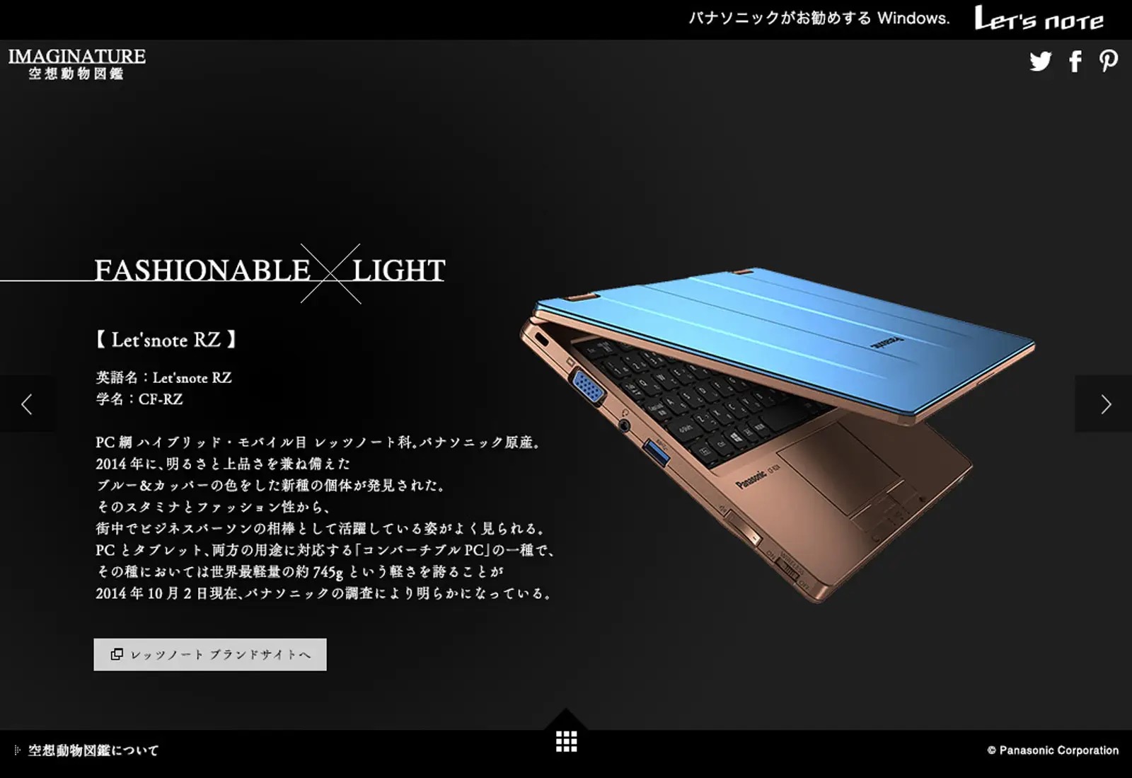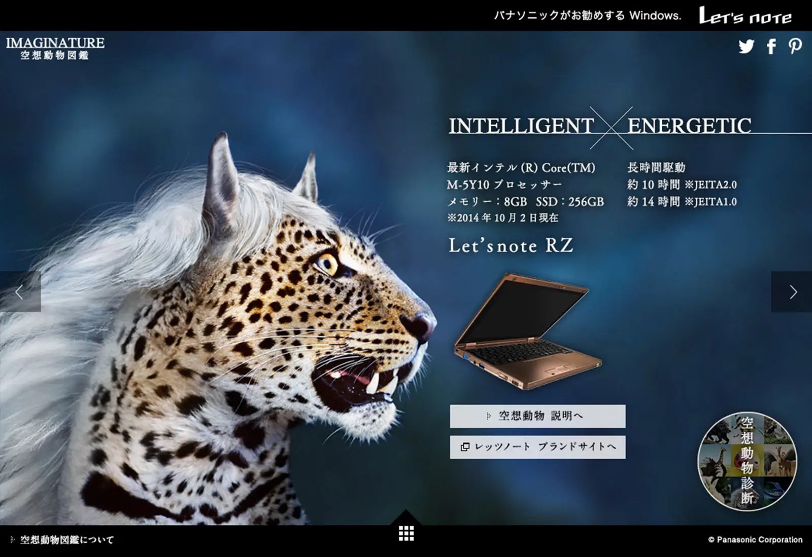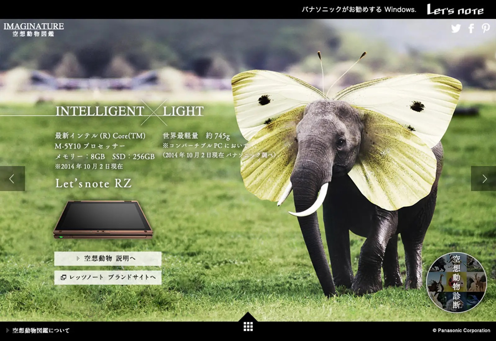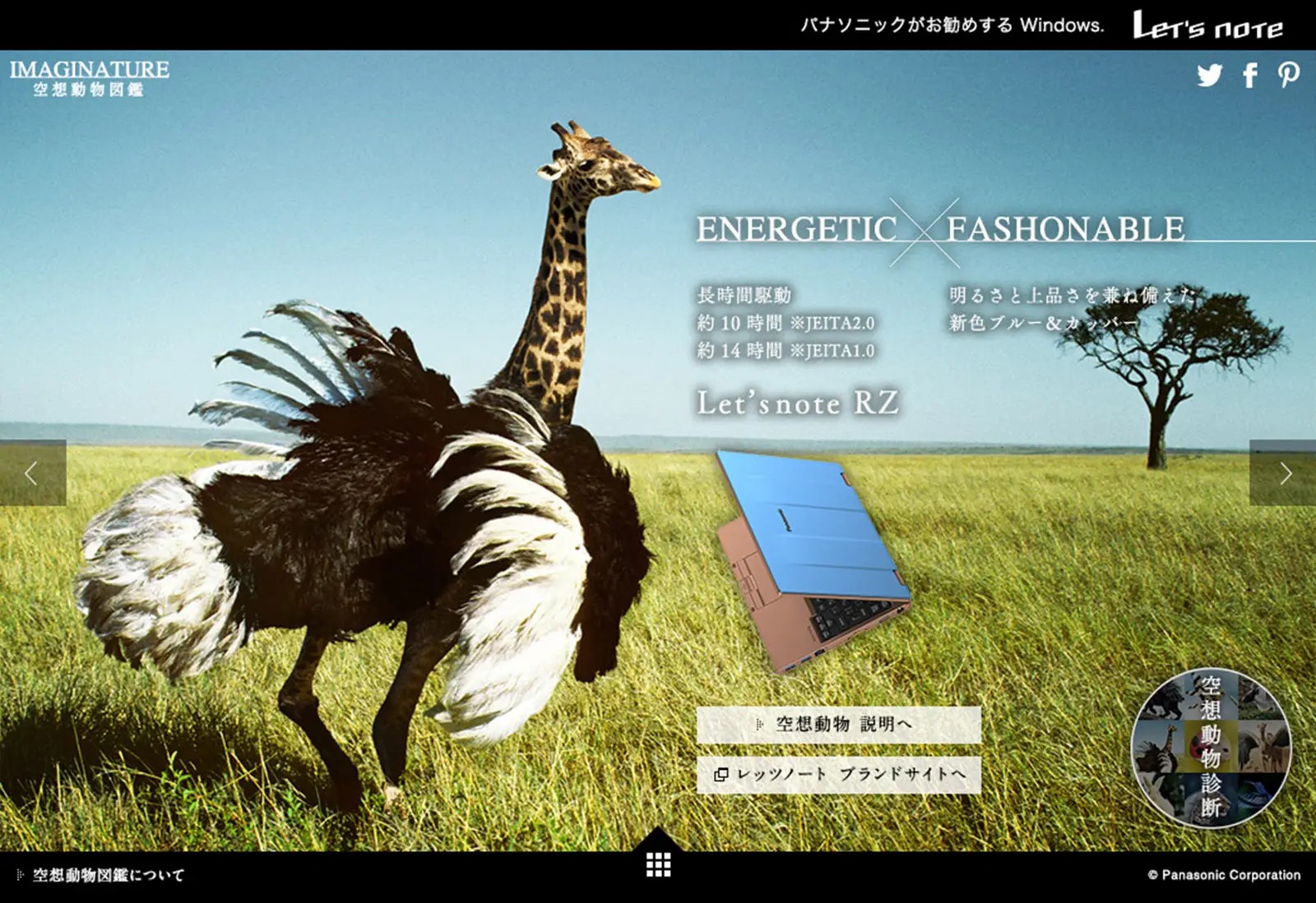「レッツノートRZシリーズ」を若年層にもっと知ってもらうことを目的に、商品の最大の特徴である、相反する魅力の両立(「軽量なのに、頑丈」、「コンパクトなのに、ハイスペック」など)を表現するため、商品を象徴する存在として、異なる魅力を持つ動物を2種組み合わせた「空想動物」で表現したバーチャル上の『空想動物図鑑』を制作しました。