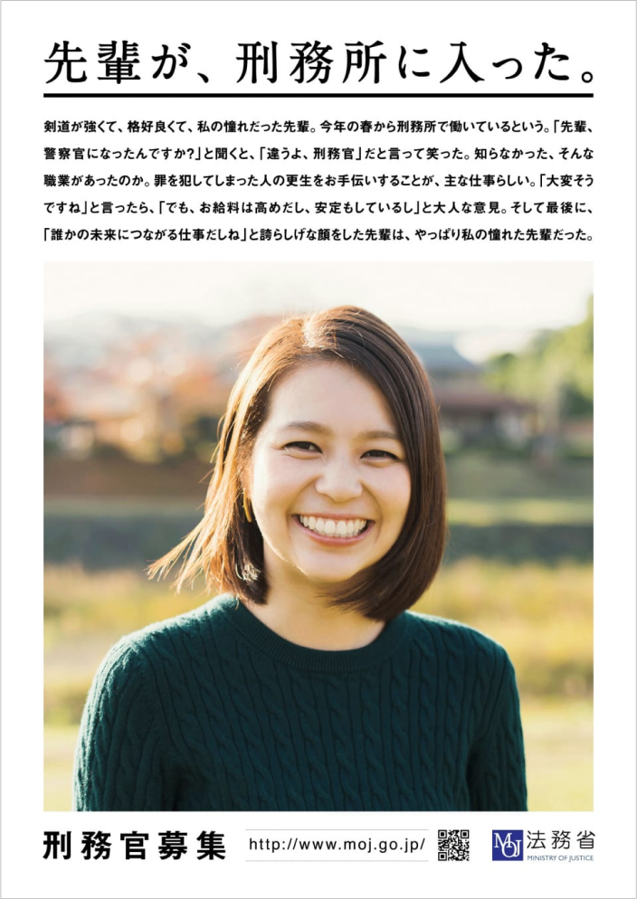 一般の人には馴染みの薄い職業であるという前提のもと、まずは刑務官という職業があることに気がついてもらえるよう、笑顔の女性のビジュアルに、「先輩が、刑務所に入った。」という刺激的なキャッチコピーを組み合わせ、このポスターへの関心を最大化することに注力しています。