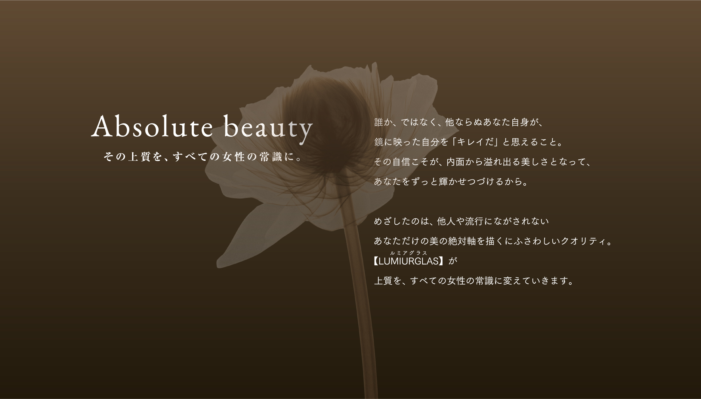 先行する競合ブランドが、“ラブ”や“モテ”という他者からの評価を軸とした価値観を打ち出すなか、後発ブランドとして異なるアプローチを取れるよう『Absolute Beauty(絶対的な美)』というコンセプトのもと、自分自身が求める理想を追求できることをブランド価値として訴求。