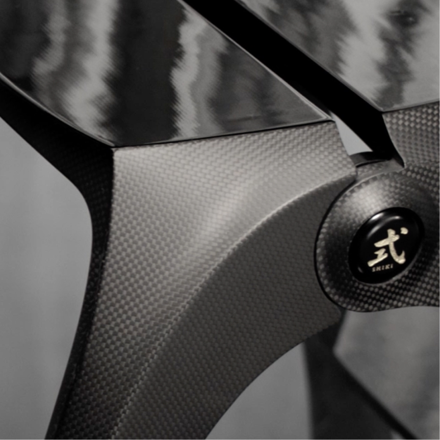 庭師や大工の現場といったプロの現場、そして家庭で日常的に使われる脚立を、アート作品に昇華させるため、プロダクトデザインは豊かな自然にあふれた日本で長い年月を経て培われてきた「織物」と「塗物」という二つの技術を融合させることをコンセプトに設計。最先端技術の結晶である織物としてのカーボンと、生活に根ざしながら発展してきた伝統技術である漆塗り、二つの日本の誇りを融合し、「SHIKI(式)」と名付けました。