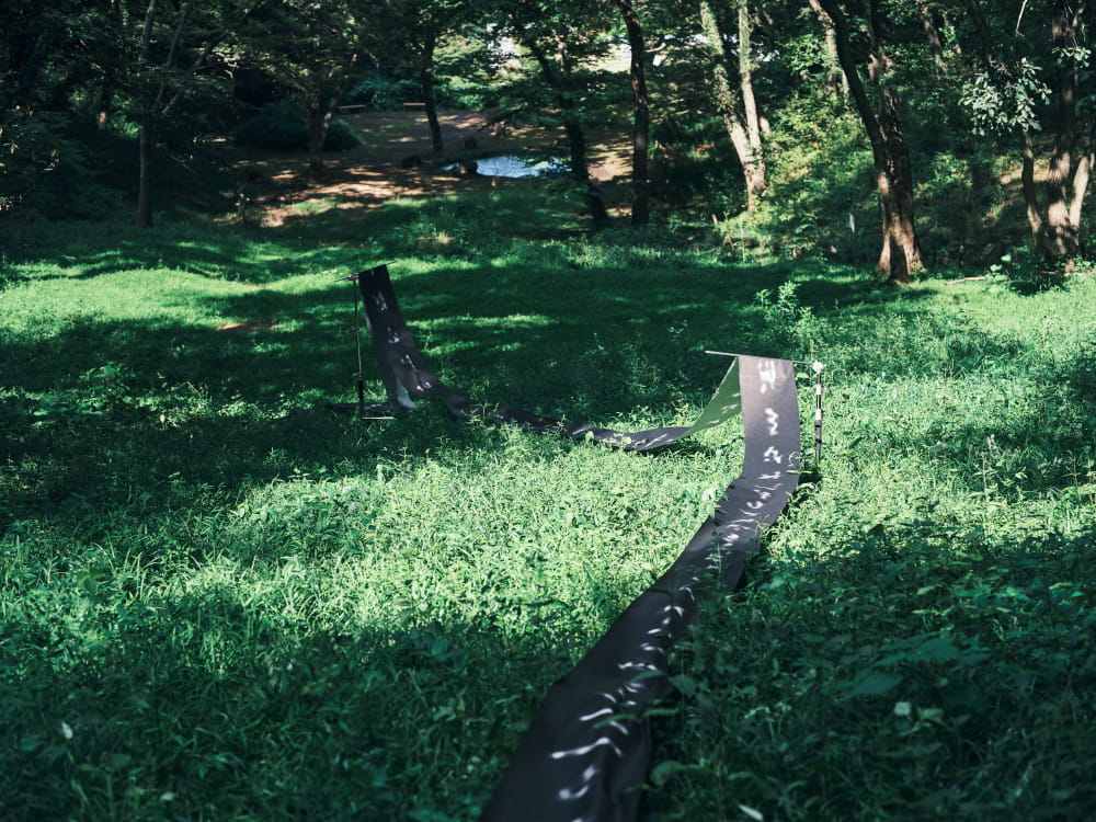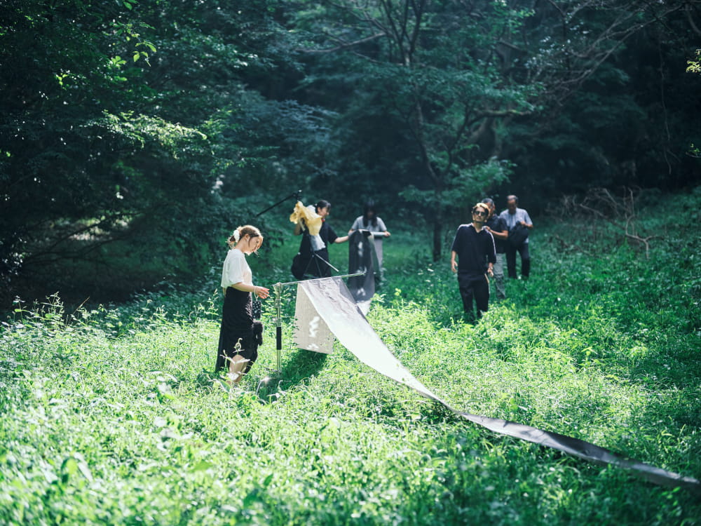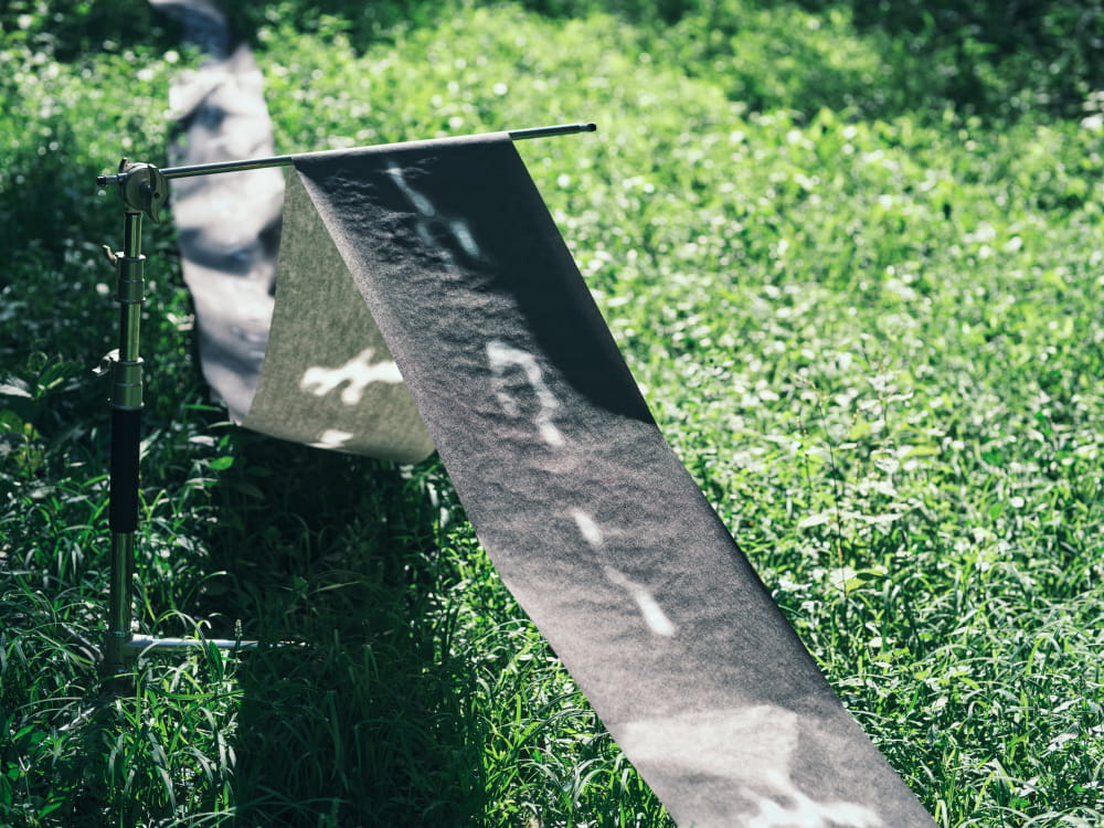 「八百万の痕跡」の掛け軸バージョンの1点として、長さ30メートルの掛け軸を作ってあったのですが、以前からこれを森の中に置いて撮影してみたいというイメージがありました。春にロケハンをして、初夏には撮影出来るかと思っていたら台風でリスケ。さらに8月にもまた台風でリスケで、三度目の正直でようやく撮影が出来ました(晴太郎じゃなくて雨太郎ですねなんて笑われていました)。