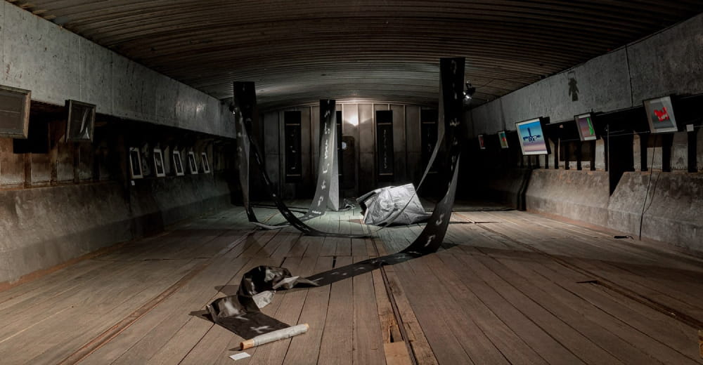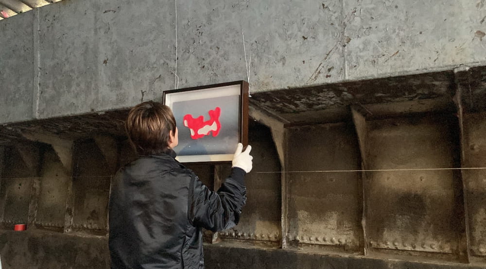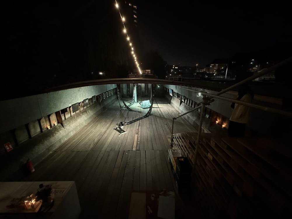ベルリン中心部を流れるシュプレー川に係留された貨物船の倉庫がそのまま展示空間になっているという、とても不思議な空間です。