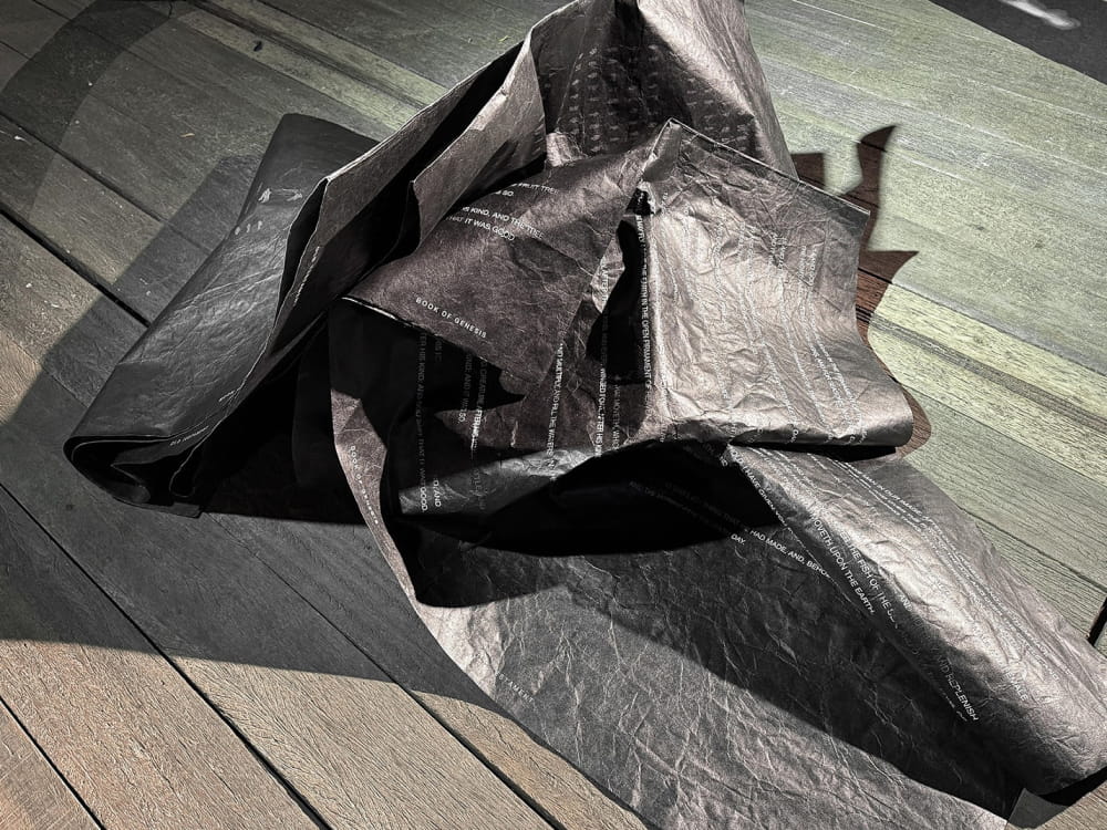 今回持っていったのは、スパイラルの個展でも展示した「八百万の痕跡」シリーズ、「こぼれおちたものの標本」「Stories Not Used」シリーズです。「八百万の痕跡」シリーズは額装バージョンと軸装バージョンに加えて、稲城市の城山公園の野外撮影の様子をお見せした、全長30メートルのものも持っていきました。展覧会に出すのは初めてですが、画像でおわかりのように会場の中心部でインスタレーションになっています。その傍らには「Stories Not Used」のBig Book。こちらもスパイラルとは見せ方を変えています。