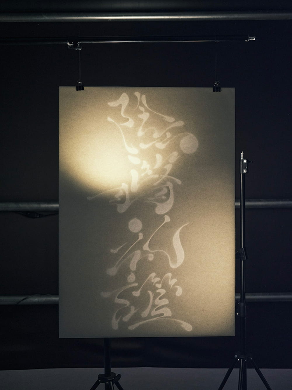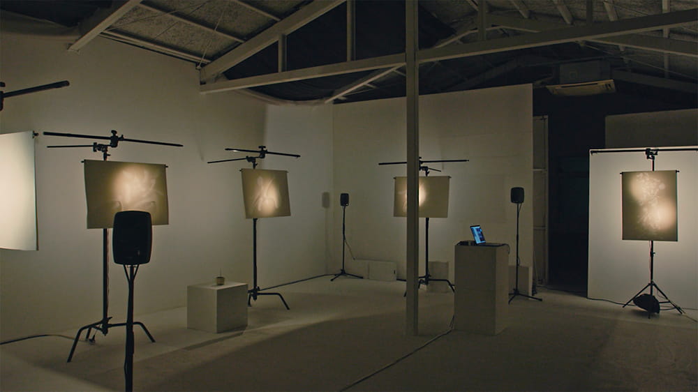 「陰翳礼讃」はアムステルダムで2018年に展示した、僕の最初期の作品なのですが、日本では部分的な展示しか実施していません。「陰翳礼讃」は美濃和紙を字の形に切り抜いて裏から光を当てて、字の形を曖昧にしながら影として映し出している作品ですが、完成形はこれにミニマルミュージックと香りまで加えたものです。音楽はMergrimのTakahisa Mitsumoriくんとコラボレーションしてオリジナルで制作したもの。香りもこの作品のために作ったものです。
